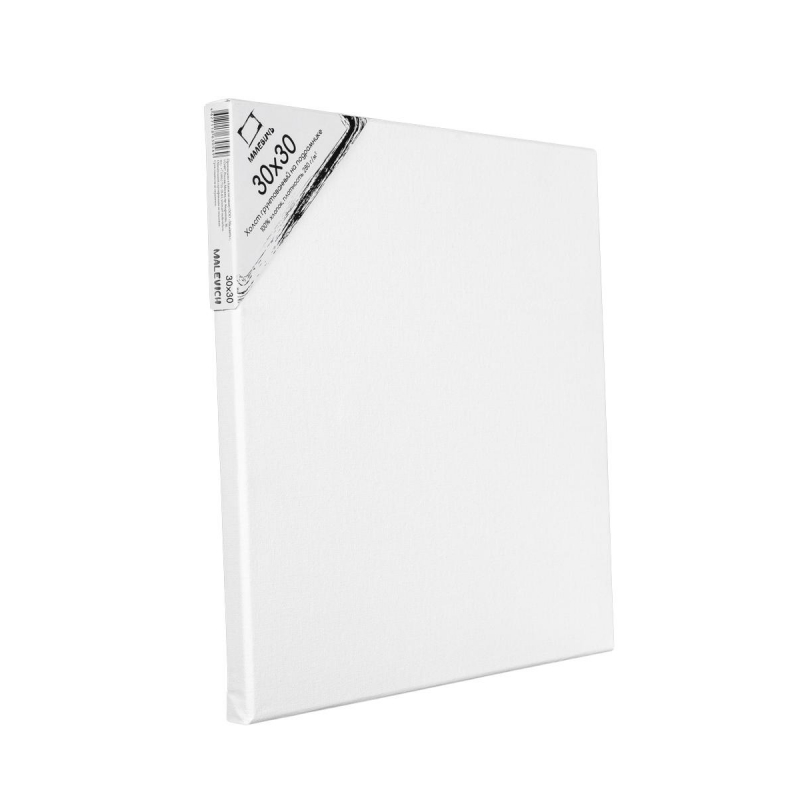 Холст на подрамнике Малевичъ, хлопок 280 г/кв.м, 30x30 см. Грунтованные холсты из натурального среднезернистого хлопка плотностью 280 г/кв.м, дающие возможность сразу же приступить к работе. Гладкая поверхность хлопкового полотна удобна для прорисовки портретов и пейзажей. В комплект входят клинья, позволяющие регулировать степень натяжения полотна.