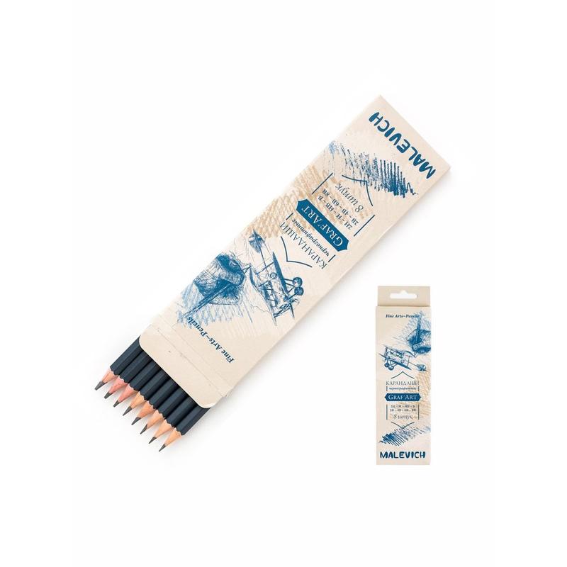 Набор чернографитных карандашей Малевичъ Graf'Art, 8 штук. Художественные чернографитные карандаши Малевичъ Graf'Art предназначены для рисования и отвечают всем требованиям, предъявляемым к профессиональной художественной продукции. Высококачественный грифель очищен от примесей, за счет чего штриховка получается равномерной и четкой. Диаметр грифеля отличается в зависимости от степени мягкости карандаша. Высококачественная древесина обеспечивает легкое затачивание, корпус и грифель не крошатся и остаются целыми даже при падении карандаша. В коллекции 8 степеней мягкости: 2Н, Н, НВ, В, 2В, 4В, 6В, 8В.