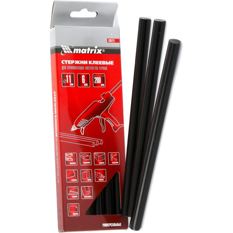 Стержни клеевые, 11x200 мм, черные, 6 штук Matrix применяются для склеивания изделий из дерева, металла, пластика, ткани, кожи, стекла, керамики, бумаги, картона, резины и других материалов. Предназначены для использования с термоклеящими пистолетами. Наилучшая склейка достигается у шершавых, пористых и имеющих высокую адгезию поверхностей. С помощью термоклея возможно создание временной водонепроницаемости при отсутствии сильного давления воды и нагревания (таким образом заделывают трещины в ведрах, садовых лейках, душевых кабинах и др.). Запрещается нагревание с помощью открытого огня и других приспособлений, применение с поверхностями, соприкасающимися с продуктами питания. Во избежание ожогов, запрещено трогать расплавленный клей руками.