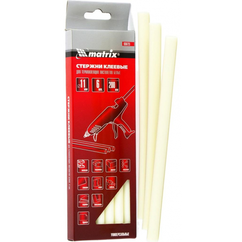 Стержни клеевые, 11x200 мм, белые, 6 штук Matrix. Применяются для склеивания изделий из дерева, металла, пластика, ткани, кожи, стекла, керамики, бумаги, картона, резины и других материалов. Предназначены для использования с термоклеящими пистолетами. Наилучшая склейка достигается у шершавых, пористых и имеющих высокую адгезию поверхностей. С помощью термоклея возможно создание временной водонепроницаемости при отсутствии сильного давления воды и нагревания (таким образом заделывают трещины в ведрах, садовых лейках, душевых кабинах и др.). Запрещается нагревание с помощью открытого огня и других приспособлений, применение с поверхностями, соприкасающимися с продуктами питания. Во избежание ожогов, запрещено трогать расплавленный клей руками.