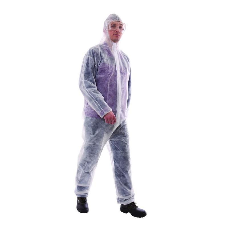 Универсальный одноразовый комбинезон для защиты от производственных загрязнений и механических воздействий (от нетоксичной пыли). Имеет притачной капюшон. По низу рукавов, брюк и краю капюшона пристрочена эластичная резинка. Имеет широкий спектр применения. Работы в загрязненных помещениях, малярные работы, распыление краски, установка и монтаж оборудования, профессиональная уборка помещений, работа на предприятиях пищевой промышленности, машиностроение, автомобилестроение, агросектор. Размер: 50-52. Рост: универсальный. Материал: спанбонд. Цвет: белый. Плотность материала: 40 г/кв.м. Тип защиты: 5 (защита всего тела от твердых переносимых по воздуху веществ).