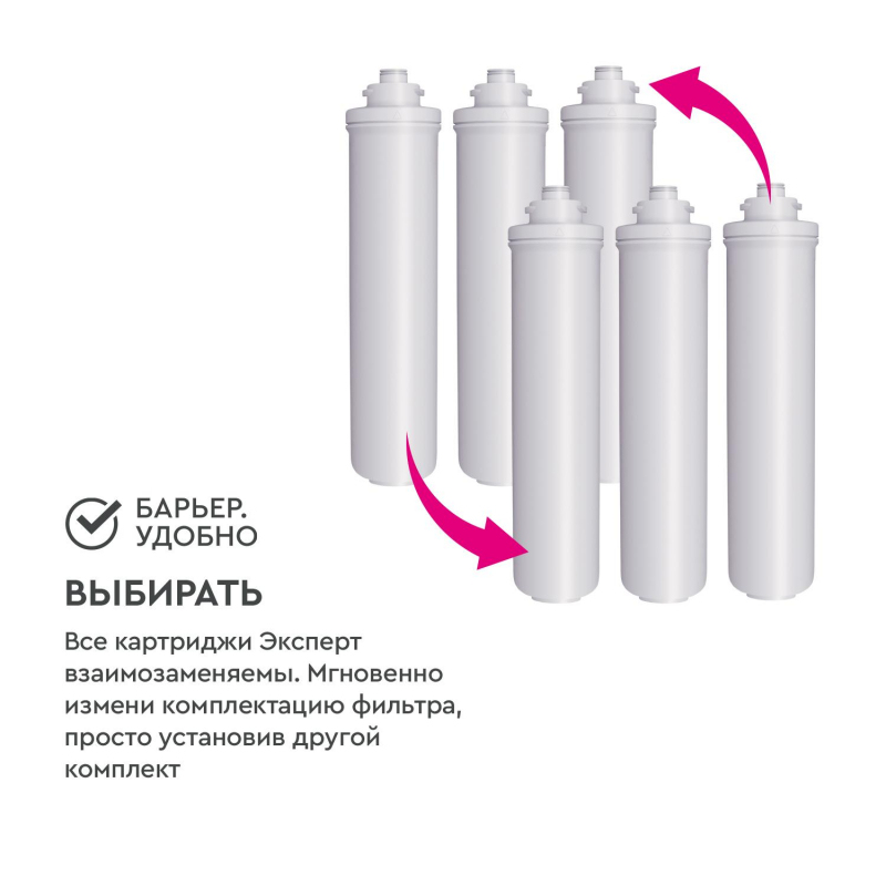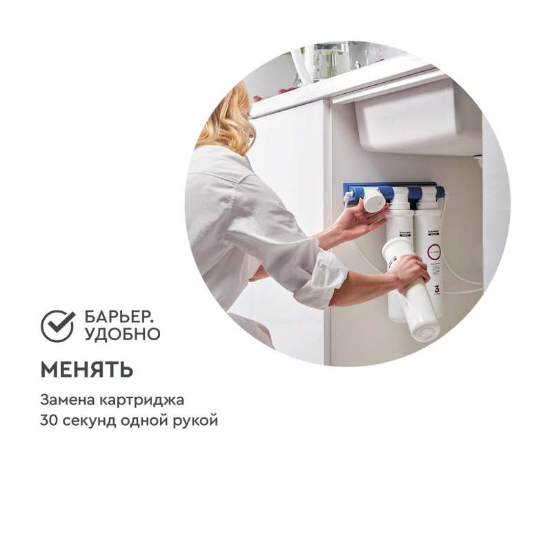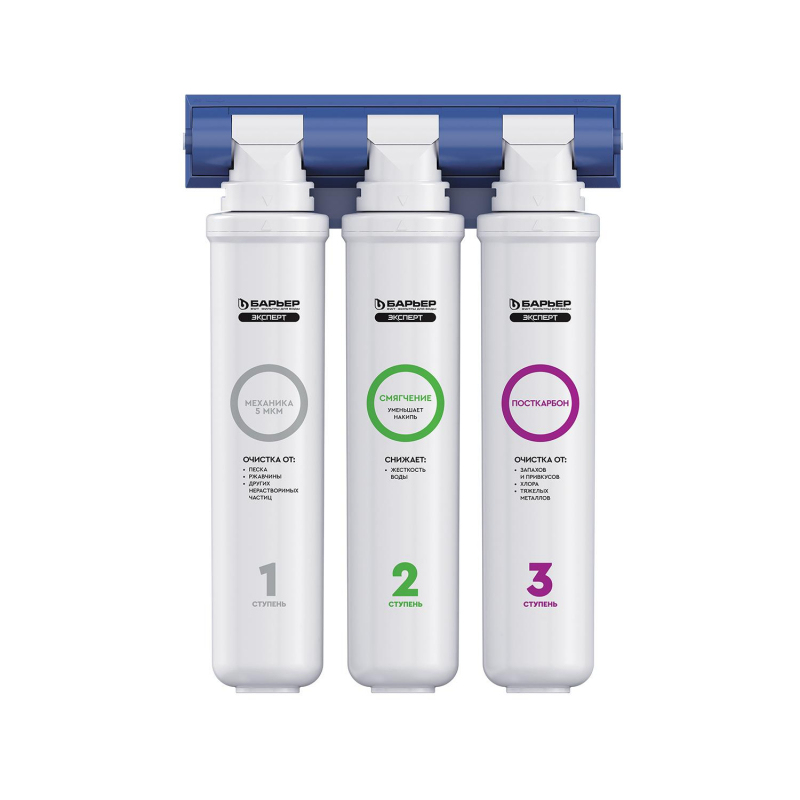 Водоочиститель Барьер Эксперт трехступенчатый (защита от накипи). Компактный фильтр для специализированной очистки воды с повышенным содержанием солей жесткости. Позволяет забыть о проблеме накипи и получить вкусную безопасную воду. Удобная конструкция поместится даже на небольшой кухне. Производительность - 2 л/мин. Ресурс - 10000 литров. Вода проходит три этапа очистки: 1."Барьер Эксперт Механика" удаляет любые механические примеси до 5 мкм (песок, пластик, ржавчину и т.д.). 2."Барьер Эксперт Смягчение" предотвращает образование накипи. Эффективно снижает карбонатную жесткость, из-за которой образуется осадок в чайнике. Средний ресурс ступени при жесткости от 3 до 5 мг-экв/л составляет 500 литров. 3."Барьер Эксперт ПостКарбон" - финишная очистка и кондиционирование, устранение неприятных привкусов и остаточного хлора. В линейке Эксперт воплощены наши лучшие разработки, что дает вам преимущества: -технология SmartLock предотвращает протечки и срыв картриджа под давлением. -технология OneTouch позволяет быстро поменять картридж без специальных знаний, инструментов или ключей. -система протестирована по стандарту NSF (США) на максимальное давление 30 АТМ. 4-х кратный запас прочности. Простая, но продуманная конструкция позволяет установить фильтр за 30 минут. Один проточный фильтр Барьер за год помогает уберечь планету от полтонны пластика. По исчерпанию ресурса картриджи можно сдать на переработку.