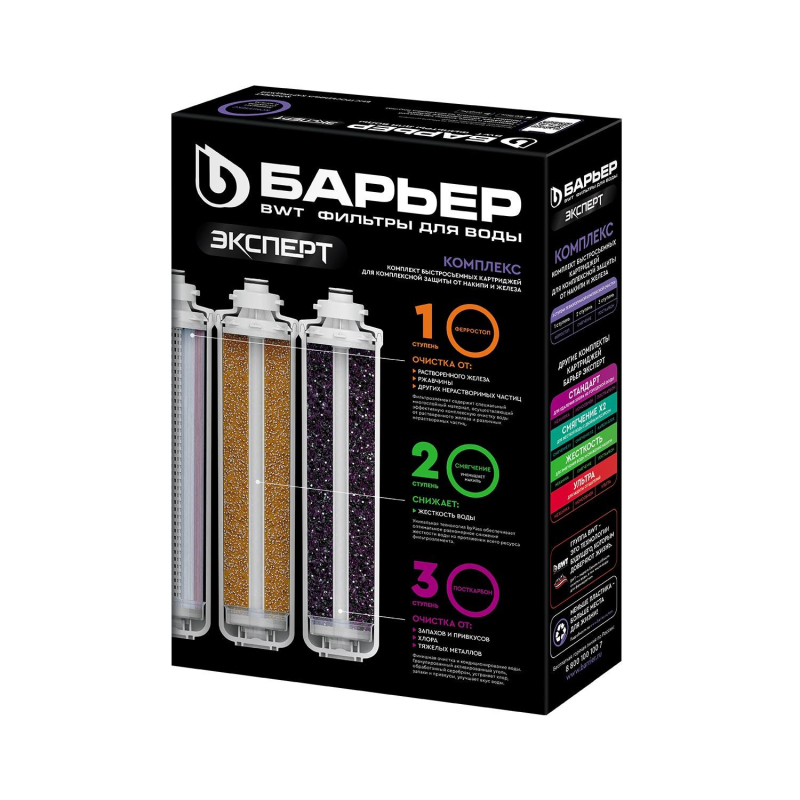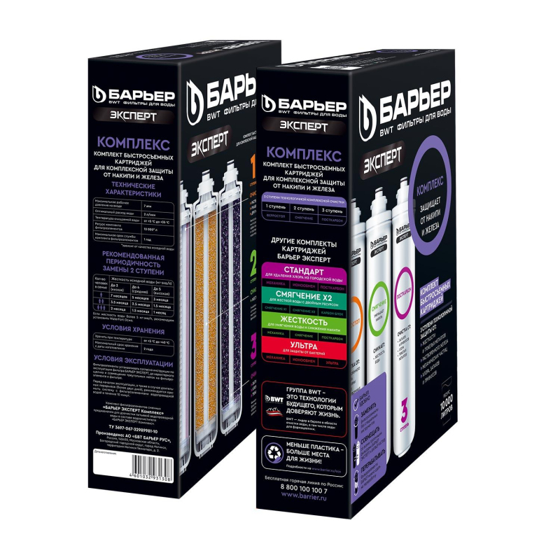 Картридж сменный Барьер Эксперт (защищает от накипи и железа). Картриджи семейства Барьер Эксперт. Позволяют получить вкусную безопасную воду и забыть о проблеме накипи, металлическом привкусе воды и желтоватом осадке в чайнике. В комплект входит: 1."Барьер Эксперт Ферростоп" содержит специальный многослойный материал, эффективно удаляющий не только железистые примеси, но и растворенное железо. Финишный слой препятствует сбросу отфильтрованного железа в чистую воду. 2."Барьер Эксперт Смягчение" предотвращает образование накипи. Эффективно снижает карбонатную жесткость, из-за которой образуется осадок в чайнике. Средний ресурс ступени при жесткости от 3 до 5 мг-экв/л составляет 500 литров. 3."Барьер Эксперт ПостКарбон" - финишная очистка и кондиционирование, устранение неприятных привкусов и остаточного хлора. В линейке Эксперт воплощены наши лучшие разработки, что дает вам преимущества: -технология SmartLock предотвращает протечки и срыв картриджа под давлением. -технология OneTouch позволяет быстро поменять картридж без специальных знаний, инструментов или ключей. -Протестированы по стандарту NSF (США) на максимальное давление 30 АТМ. 4-х кратный запас прочности. Производительность - 2 л/мин. Ресурс - 10000 литров. Один проточный фильтр Барьер за год помогает уберечь планету от полтонны пластика. По исчерпанию ресурса картриджи можно сдать на переработку.