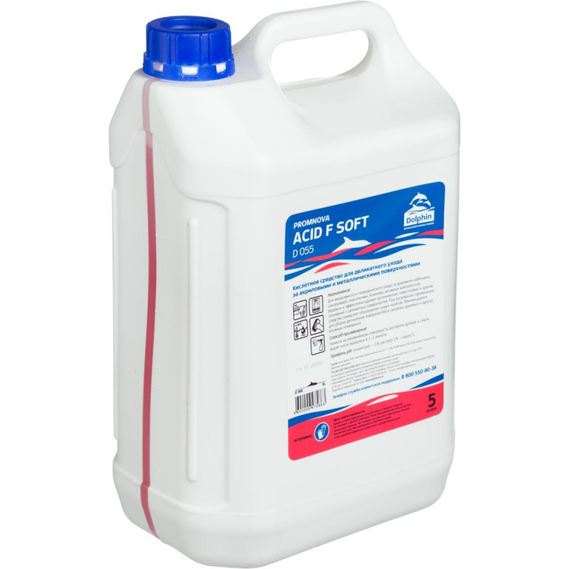 Средство для мытья сантехники и кафеля Dolphin Promnova Acid F Soft 5 л. Назначение: для ежедневного и периодического ухода за душевыми кабинами, сантехникой, смесителями. Комплекс активных компонетнов бережно и эффективно удаляет органические, известковые и другие отложения с деликатных поверхностей. При регулярном применении средство замедляет образование новых налетов. Область применения: рекомендуется для уборки деликатных поверхностей в санузлах, душевых и других влажных помещений. Способ применения: нанести на увлажненную поверхность, растереть щеткой и смыть водой после выдержки в 1-2 минуты. Срок годности: 12 мес.