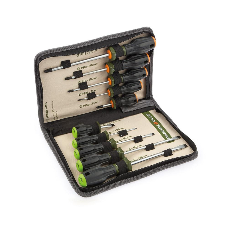 Состав набора: Шлиц: 3,0x75, 5,0x100, 6,5x38, 6,5x150, 8x150 мм Philips: PH0x75, PH1x100, PH2x38, PH2x100, PH3x150 мм Тетроновый пенал Сталь: S2 Твердость: 57 - 61 HRC ХромированиеВнешний вид и/или характеристики товара могут быть изменены производителем в соответствии с производственным процессом.