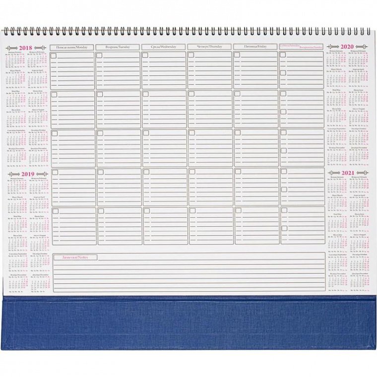 Планинг недатированный настольный Attache. Размер: 490×350 мм. Обложка отсутствует. Подложка выполнена из плотного картона, обклеен бумвинилом, есть прижимной клапан синего цвета, на который можно нанести логотип. Возможно нанесение тиснения фольгой или шелкографией, тампопечатью. Планинг состоит из 12 листов офсетной бумаги плотностью 70 г/кв.м, скрепленных спиралью. На каждом листе — графы для всех дней текущего месяца, календарная сетка на четыре года (2018-2021 гг) и поле для заметок. Индивидуальная упаковка (пакет с липким слоем).