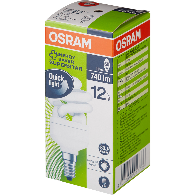 Компактная интегрированная люминесцентная лампа Osram (форма спирали), излучает холодный белый свет с цоколем Е14, мощность 12 Вт. Энергосберегающее освещение, цветовое впечатление, аналогичное свету лампы накаливания. Матовая внешняя колба. Код модели DSST MCTW 12W/8. Преимущества изделия: - Срок службы 12000 h - Очень компактной формы и высокоэффективный - Исключительно быстрое нарастание светового потока благодаря использованию технологии Quick Light - Низкие затраты на техобслуживание, высокая световая отдача - Сокращение энергопотребления до 80 % по сравнению с обычными лампами накаливания Характеристики изделий: - Коэффициент цветопередачи Ra ? 80 - Световой поток 740 Лм - Цветовая температура 4000 К Основные габариты (мм) см. фото №3: - Длина 97 мм ( L ) - Диаметр трубки 48 мм ( D ) - Вес продукта 48 г/шт. Области применения: - Общее освещение - В местах, где необходимы компактные и эффективные лампы - Высококачественные домашние и рабочие интерьеры - Использование на открытом воздухе только в закрытых и вентилируемых светильниках Лицензиатом торговой марки Osram в общем освещении является компания Ledvance.