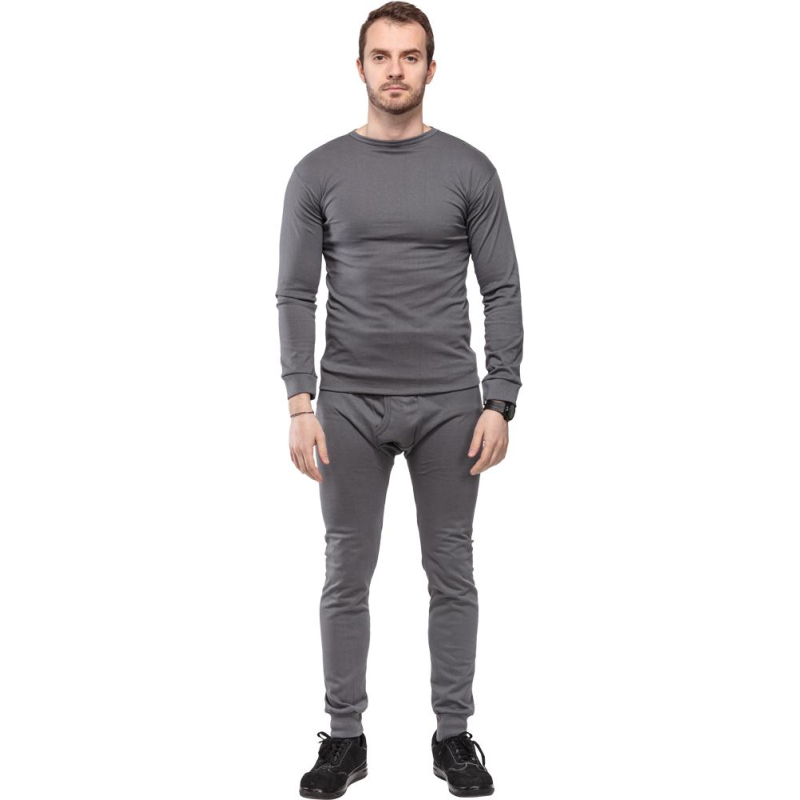 В комплект входит трикотажная фуфайка и кальсоны. Фуфайка имеет круглую горловину, манжеты на рукавах. Кальсоны на резинке, гульфик, нижние края брюк имеют трикотажные манжеты. Состав ткани: 100% хлопок. Плотность: 250 г/кв.м. Цвет: серый.