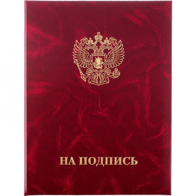 Адресная папка формата А4. Папка выполнена из бумвинила бордового цвета с разводами (слой ПВХ на бумажной основе). Внутренние вклейки — из плотного льна. На обложке надпись «На подпись» и герб России (тиснение золотой фольгой). Внутри есть фиксирующий ремешок для документов. Ручная сборка. На папку можно нанести логотип. Предназначена для подачи документов на подпись руководителю.