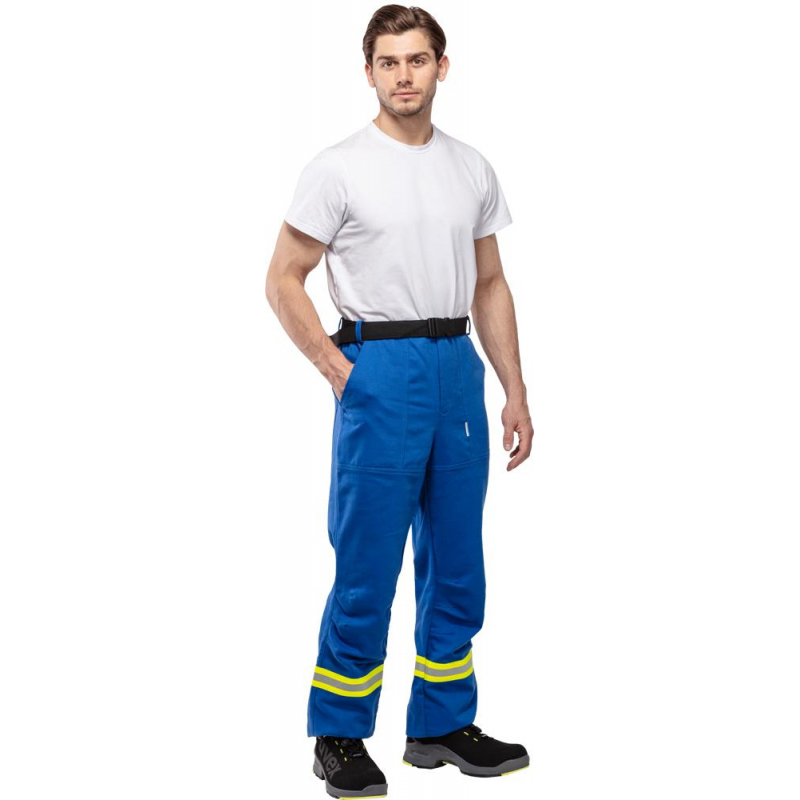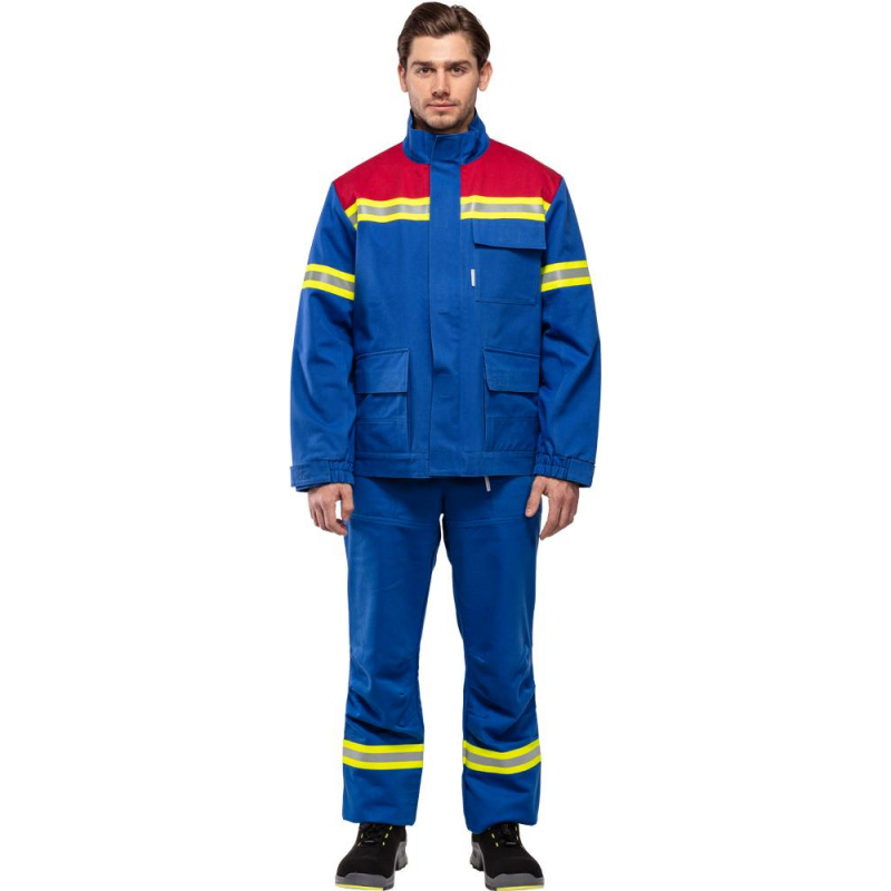 Костюм термостойкий состоит из куртки и брюк. Размер: 56-58. Рост: 182-188. Состав ткани: 87% хлопок, 12% нейлон, 1% антиэлектростатичная нить. Цвет: васильковый с красной вставкой на куртке. Куртка прямого силуэта с воротником стойка и центральной застежкой на тесьму 'молния', закрываемой двумя планками с текстильными застежками. Рукава с манжетами на эластичной тесьме и регулирующими патами. По низу куртки предусмотрен притачной пояс с регулировочными патами на контактной ленте. Левый внутренний карман для ношения документов, левый нагрудный карман, нижние накладные карманы с передней объемной складкой. Карманы снабжены клапанами с застежками на контактную ленту. СОП 50 мм, желто-серая. На полочках и спинке куртки по шву притачивания кокетки, на рукавах выше уровня локтя. Брюки прямого силуэта с выточками в области колена. Застежка гульфика на молнии. Брюки комплектуются текстильным ремнем с пластиковой пряжкой. Передние накладные карманы с наклонным входом. Задние карманы отсутствуют. СОП 50 мм, желто-серая, на передних и задних половинках ниже уровня колена. СВП 50 мм, желто-серая, на передних и задних половинках ниже уровня колена. Передние накладные карманы с наклонным входом. Задние карманы отсутствуют.