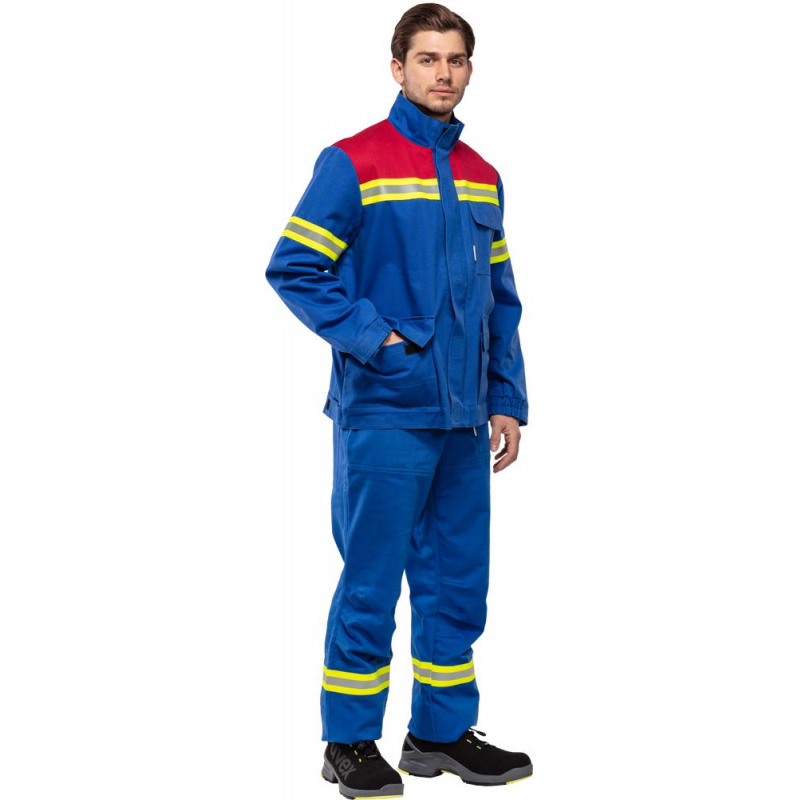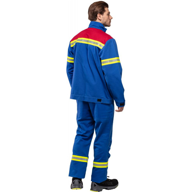 Куртка-накидка термостойкая. Размер: 52-54. Рост: 170-176. Состав ткани: 87% хлопок, 12% нейлон, 1% антиэлектростатичная нить. Цвет: васильковый с красной вставкой. Куртка прямого силуэта с воротником стойка и центральной застежкой на тесьму 'молния', закрываемой двумя планками с текстильными застежками. Рукава с манжетами на эластичной тесьме и регулирующими патами. По низу куртки предусмотрен притачной пояс с регулировочными патами на контактной ленте. Левый внутренний карман для ношения документов, левый нагрудный карман, нижние накладные карманы с передней объемной складкой. Карманы снабжены клапанами с застежками на контактную ленту. СОП 50 мм, желто-серая. На полочках и спинке куртки по шву притачивания кокетки, на рукавах выше уровня локтя.