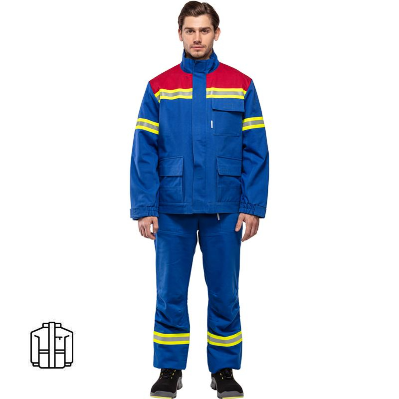 Куртка-накидка термостойкая. Размер: 48-50. Рост: 182-188. Состав ткани: 87% хлопок, 12% нейлон, 1% антиэлектростатичная нить. Цвет: васильковый с красной вставкой. Куртка прямого силуэта с воротником стойка и центральной застежкой на тесьму 'молния', закрываемой двумя планками с текстильными застежками. Рукава с манжетами на эластичной тесьме и регулирующими патами. По низу куртки предусмотрен притачной пояс с регулировочными патами на контактной ленте. Левый внутренний карман для ношения документов, левый нагрудный карман, нижние накладные карманы с передней объемной складкой. Карманы снабжены клапанами с застежками на контактную ленту. СОП 50 мм, желто-серая. На полочках и спинке куртки по шву притачивания кокетки, на рукавах выше уровня локтя.