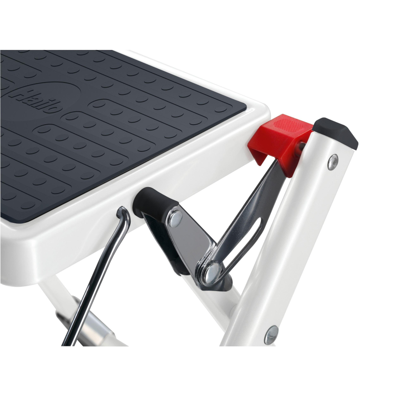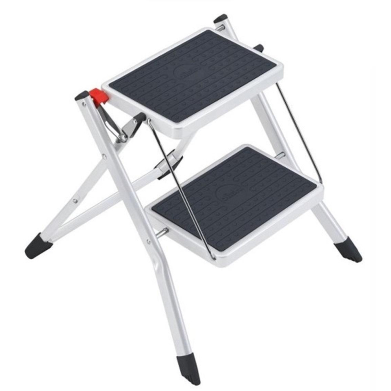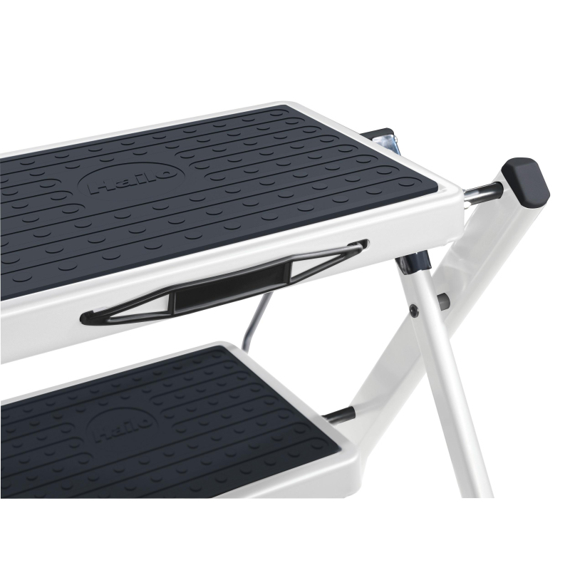 Двухступенчатая стремянка. Цветная. Материал - сталь, притивоскользящее покрытие на ступенях, плюс замок с фиксацией положения для большой надежности. Максимальная нагрузка - 150 кг. Высота рабочей поверхности - 44 см. Рабочая высота 225 см. Очень компактная в сложенном. Ручка для переноски. Механизм раскладывания со специальной клавишей разблокировки.