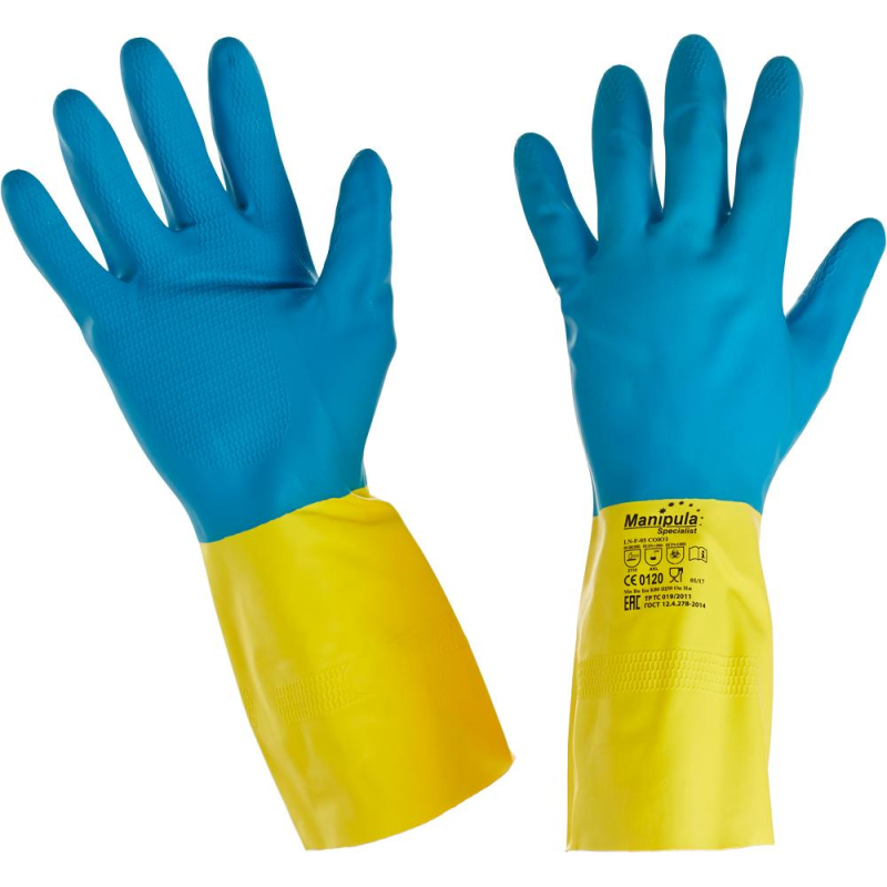 Перчатки КЩС Manipula Союз (LN-F-05) желто-синего цвета, с хлопковым напылением. Размер: 7-7,5. Материал: латекс/неопрен. Длина: 320 мм. Толщина: 0,7 мм. Рельефная поверхность области захвата. Степень защиты от кислот: 80%. Степень защиты от щелочей: 50%. Количество пар в упаковке: 1. Количество упаковок в транспортной коробке: 120.