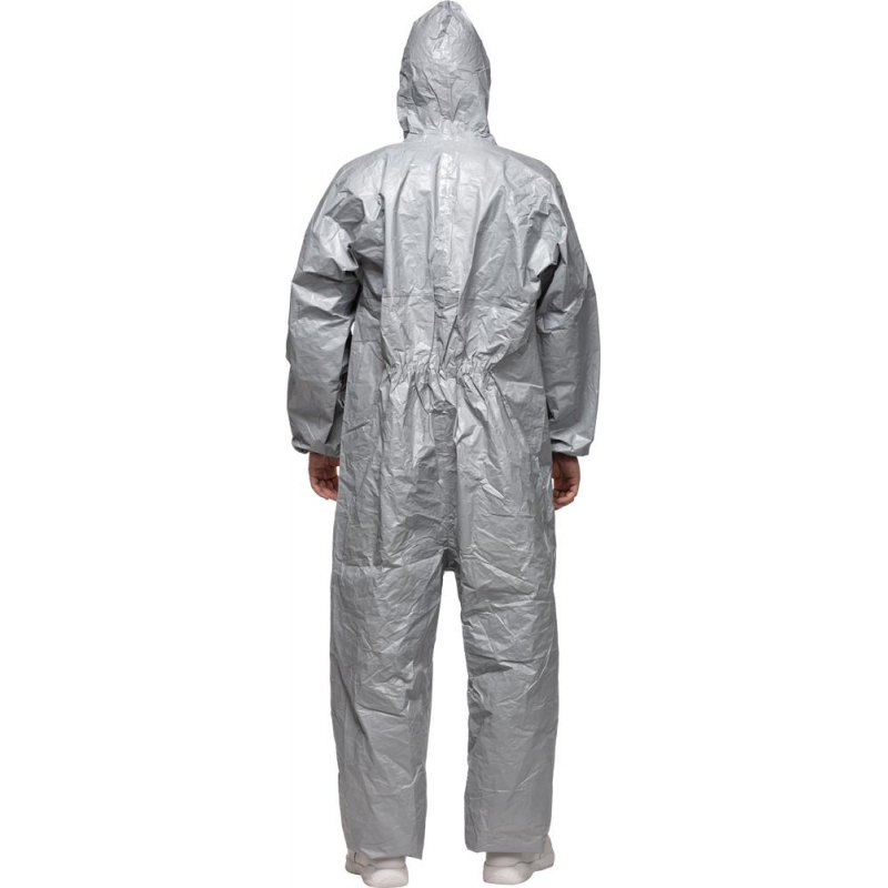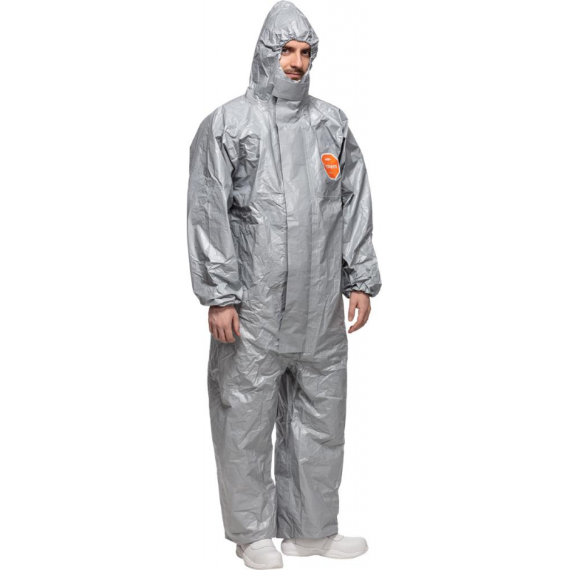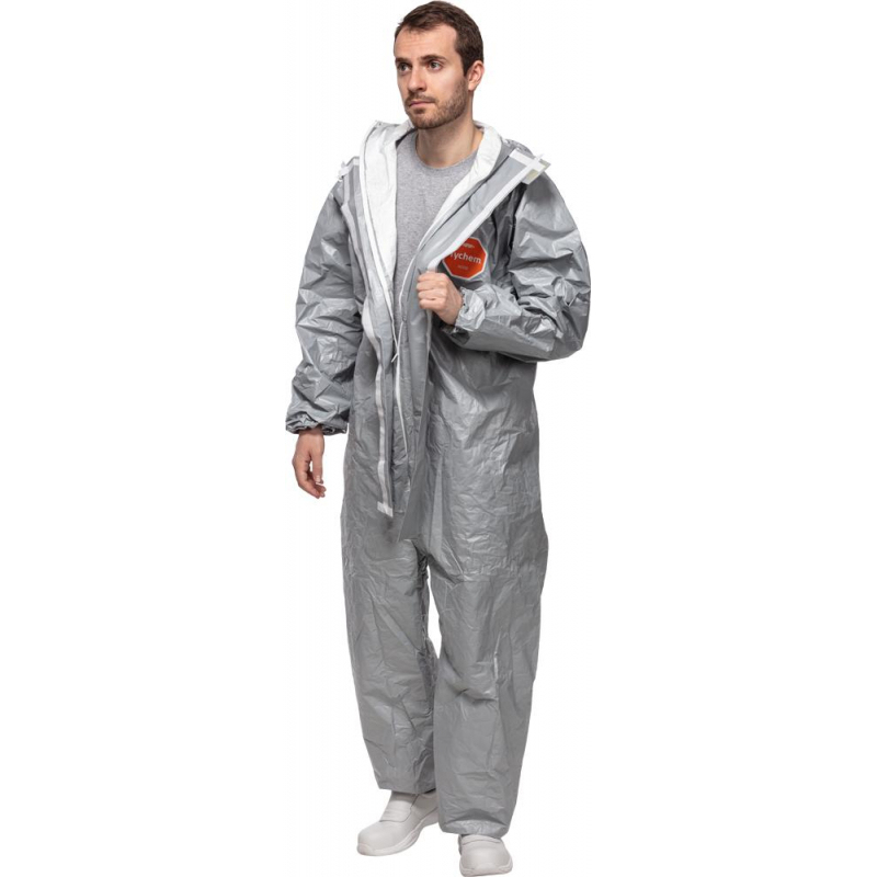 Комбинезон Тайкем 6000 F изготовлен из материала тайвек ламинированного барьерной пленкой с двойным полимерным покрытием. Сочетание барьерной пленки и полимера придает материалу Тайвек непроницаемость для твердых частиц (порошков и опасной пыли) и достаточно стойким к просачиванию многих жидкостей (концентрированных неорганических кислот и оснований, органических химикатов, крови и переносимых кровью патогенов), некоторых химикатов в виде аэрозолей, а также многих широко применяемых газов. Надежная защита от жидких неорганических химикатов предельно высокой концентрации при давлении до 5 бар. Непроницаем для твердых частиц любых размеров. Антистатическая обработка с внутренней стороны, электростатическая защита в соответствии со стандартом EN 1149-1. Низкая степень появление электростатических зарядов на материале. Хорошо совместим с другими СИЗ. Капюшон обеспечивает свободу движений головы и хорошую обзорность. Застежка-молния защищенная двойным самоклеящимся клапаном. Эластичные манжеты, низ брюк, талия и вырез для лица. Швы, прошитые и герметезированые защитной лентой. Дополнительная фиксация рукава с помощью петли, которая надевается на большой палец. Применяется на химических и фармацевтических предприятиях, на предприятиях нефтяной промышленности по добычи и переработки нефти, в качестве защиты от воздействия боевых отравляющих веществ, при устранении последствий аварийных ситуаций. Материал: нетканое полотно тайвек с барьерной пленкой и двойным полимерным покрытием. Размер: 44 (М). Рост: 168-172. Тип защиты: 3, 4. Цветы: серый.