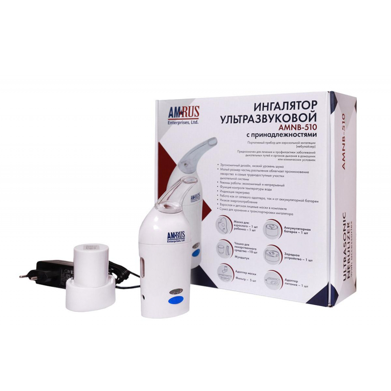 Компактный ультразвуковой ингалятор AMNB-510 предназначен для лечения заболеваний на всех уровнях дыхательной системы. Позволяет использовать все лекарственные средства на солевых растворах (не рекомендуются муколитики, антибиотики и гормоны). Режим работы 30 мин./30 мин., что позволяет проводить несколько ингаляций подряд. Удобен в использовании, транспортировке и хранении. Обладает низким уровнем шума. В комплект входит блок питания, позволяющий пользоваться прибором в отсутствии электросети. Характеристики: - вид - ультразвуковой; - размер частиц - 4,5 MMAD мкм; - уровень шума, не более - 55 дБА; - производительность - 0,25 - 0,7 мл/мин; - остаток жидкости - не более 1,0 мл; - емкость медицинской чашки - 8 мл (оптимально), 10 мл (мах) - автоматическое отключение - ~ через 3 минуты; - частота преобразователя - 2,5 МГц; - рабочая t С / влажность - от 10 до 40 С /от 80% (при 25 С); - температура хранения - от -50 °С до +50 °С; - степень защиты от проникновения воды - IPX 1; - адаптер питания - вход: ~220 В; 50 Гц / выход: 18 В; 1 А; - масса изделия - 120 г; - габариты изделия (ДхШхВ) - 6,3х4,5х15,2 см; - тип аккумулятора - Ni-MH; - напряжение - 12 В; - ток заряда - 180-360 мА; - емкость - 420 мА/ч; - размер аккумулятора - 6х4х4,3 см; - масса аккумулятора - 73 г; - вес изделия (брутто) - 800 г; - габариты коробки (ДхШхВ) - 24,5х8х24,5 см; - гарантия - 1 год; - страна происхождения - Китай. Комплектация 1. Ингалятор. 2. Чашка для лекарственного средства. 3. Насадка для рта (мундштук). 4. Маски для лица (взрослая и детская). 5. Адаптер для маски. 6. Запасные фильтры (10 штук). 7. Аккумуляторная батарея. 8. Зарядное устройство. 9. Адаптер питания. 10. Сумка. 11. Руководство пользователя. 12. Упаковочная коробка.