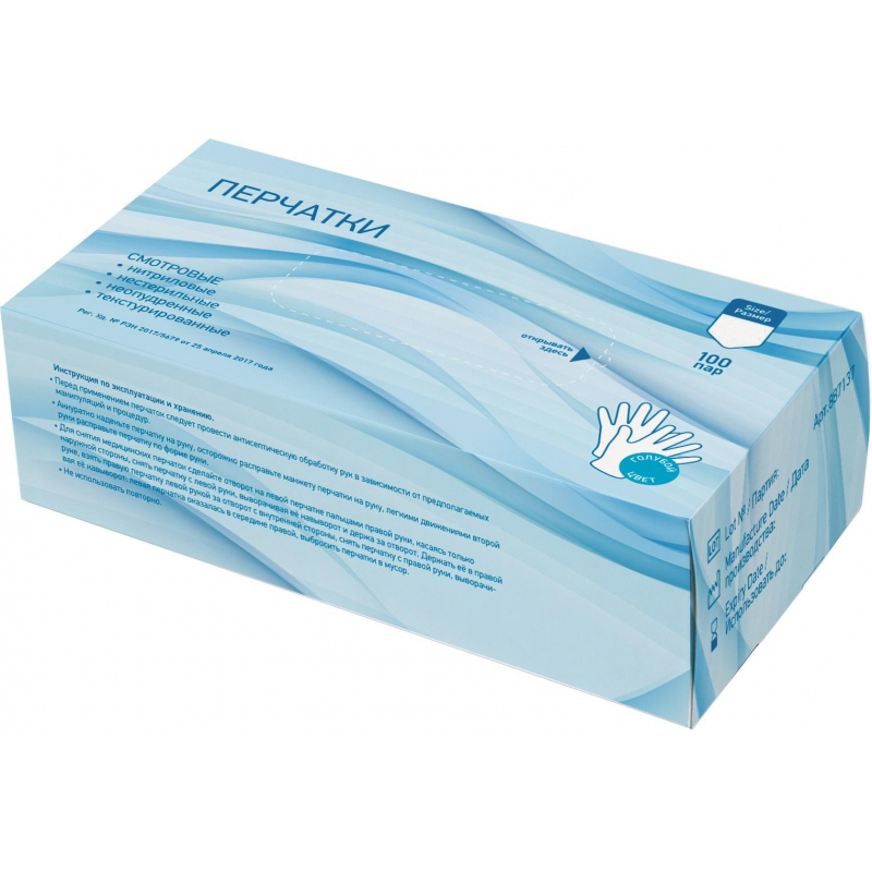 Назначение: нестерильные смотровые перчатки из нитрила отличаются большой прочностью на разрыв и обеспечивают надежную защиту от несанкционированных проколов и контактов с агрессивными химическими веществами. Конструкция: внешняя поверхность перчаток текстурирована, благодаря чему во время работы сохраняется высокая тактильная чувствительность и обеспечивается особо прочный захват. Форма: плоская, неанатомическая. Размер перчаток - XL. Длина манжеты 240 мм. Противопоказания и меры предосторожности: непереносимость материалов. Упаковка и условия хранения: картонная коробка. Хранить перчатки следует в сухом, прохладном и темном месте.