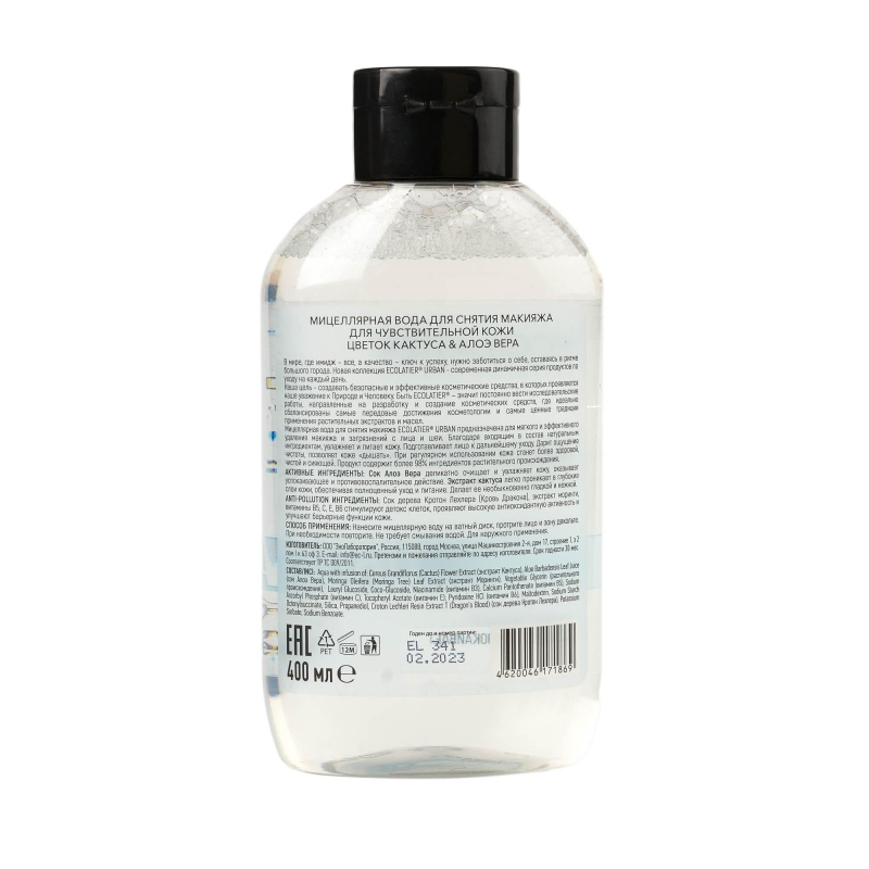 Мицеллярная вода для снятия макияжа Ecolatier Urban предназначена для мягкого и эффективного удаления макияжа и загрязнений с лица и шеи. Благодаря входящим в состав натуральным ингредиентам, увлажняет и питает кожу. Подготавливает лицо к дальнейшему уходу. Дарит ощущение чистоты, позволяет коже 'дышать'. Активные ингредиенты: - Сок Алоэ Вера деликатно очищает и увлажняет кожу, оказывает успокаивающее и противовоспалительное действие. - Экстракт кактуса легко проникает в глубокие слои кожи, обеспечивая полноценный уход и питание. Делает ее необыкновенно гладкой и нежной. - Сок дерева Кротон Лехлера (Кровь Дракона), экстракт моринги, витамины В5, В6, С, Е стимулируют детокс клеток, регенерируют кожу, проявляют высокую антиоксидантную активность и улучшают барьерные функции кожи. Состав: Aqua with infusion of: Cereus Grandiflorus (Cactus) Flower Extract (экстракт Кактуса), Aloe Barbadensis Leaf Juice (сок Алоэ Вера), Moringa Oleifera (Moringa Tree) Leaf Extract (экстракт Моринги), Vegetable Glycerin (растительного происхождения), Lauryl Glucoside, Coco-Glucoside, Niacinamide (витамин В3), Calcium Pantothenate (витамин В5), Sodium Ascorbyl Phosphate (витамин С), Tocopheryl Acetate (витамин Е), Pyridoxine HCl (витамин В6), Maltodextrin, Sodium Starch Octenylsuccinate, Silica, Propanediol, Croton Lechleri Resin Extract T (Dragon's Blood) (сок дерева Кротон Лехлера), Potassium Sorbate, Sodium Benzoate.