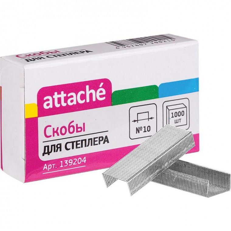 Скобы для степлера № 10 Attache предназначены для степлеров со сшивающей способностью от 2 до 20 листов. Скобы № 10 выполнены из цинкового металла. В картонной упаковке содержится 1000 скоб. В промежуточной упаковке — 20 пачек по 1000 скоб.