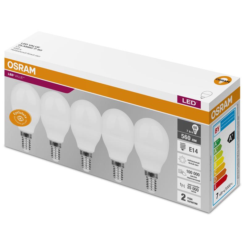 Лампа светодиодная Osram 7 Вт E14 шарообразная 4000 К нейтральный белый свет (5 штук в упаковке)