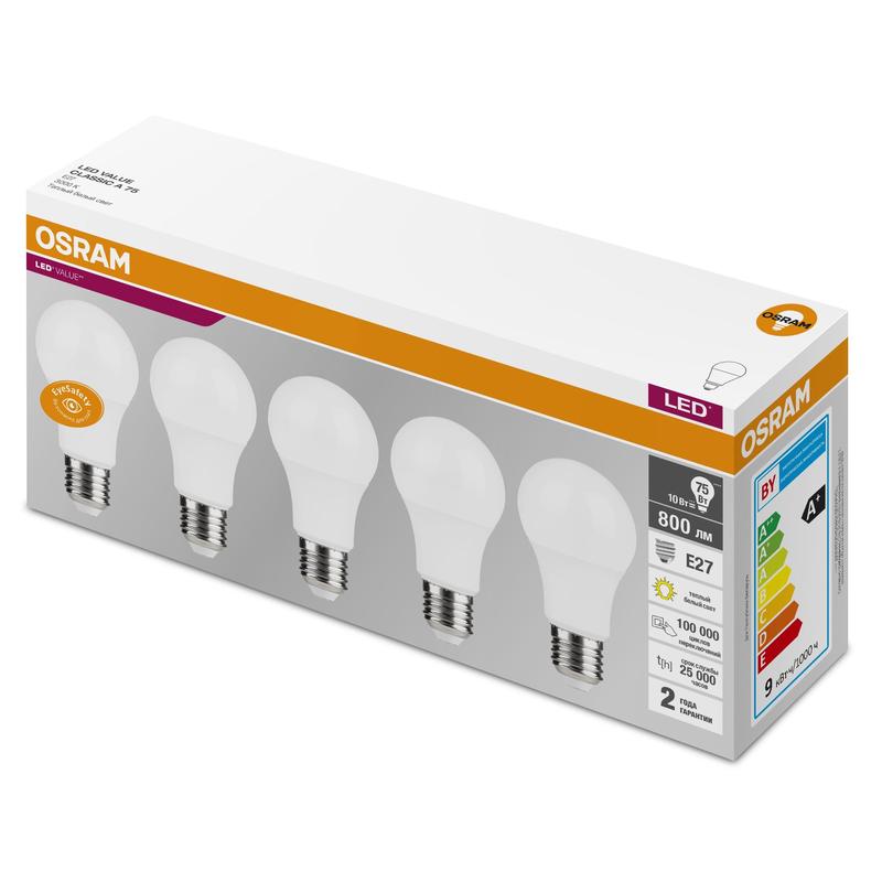 Лампа светодиодная Osram 10 Вт E27 грушевидная 3000 К теплый белый свет (5 штук в упаковке)