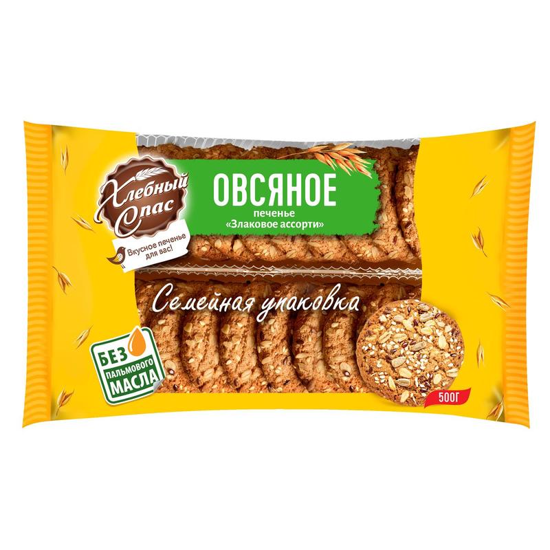 Печенье 'Овсяное злаковое ассорти' - это первое овсяное печенье для семейного потребления в 'мобильной' упаковке. Уникальный продукт, который содержит в себе максимальное количество полезных злаков и семян. Оригинальный внешний вид продукту придает обсыпка из 5 видов злаков (овсяные и ячменные хлопья, семена льна, кунжута, подсолнечника). Печенье обогащено витаминами и микроэлементами необходимыми для здоровой жизни человека. В составе печенья овсяная мука премиум качества и высокоолеионовое подсолнечное масло. Без пальмового масла и транс-жиров. Без ГМО. Без искусственных красителей, ароматизаторов и консервантов. Постный продукт. Состав: мука пшеничная хлебопекарная в/с, сахар, масло подсолнечное высокоолеиновое, мука овсяная, вода питьевая, семена кунжута, патока, мука ржаная, экстракт ячменного солода, волокна пищевые, эмульгатор - лецитин подсолнечный, разрыхлители: гидрокарбонат натрия, гидрокарбонат аммония, соль, имбирь молотый, корица молотая, ароматизатор. Пищевая ценность: белки - 6,5 г, жиры - 16 г, углеводы - 63 г. Энергетическая ценность: 420 ккал, 1770 кДж. Срок годности: 6 месяцев. Хранить при температуре (18+5)°С. Вес: 500 г. Тип упаковки: мягкая. Страна производства: Россия.