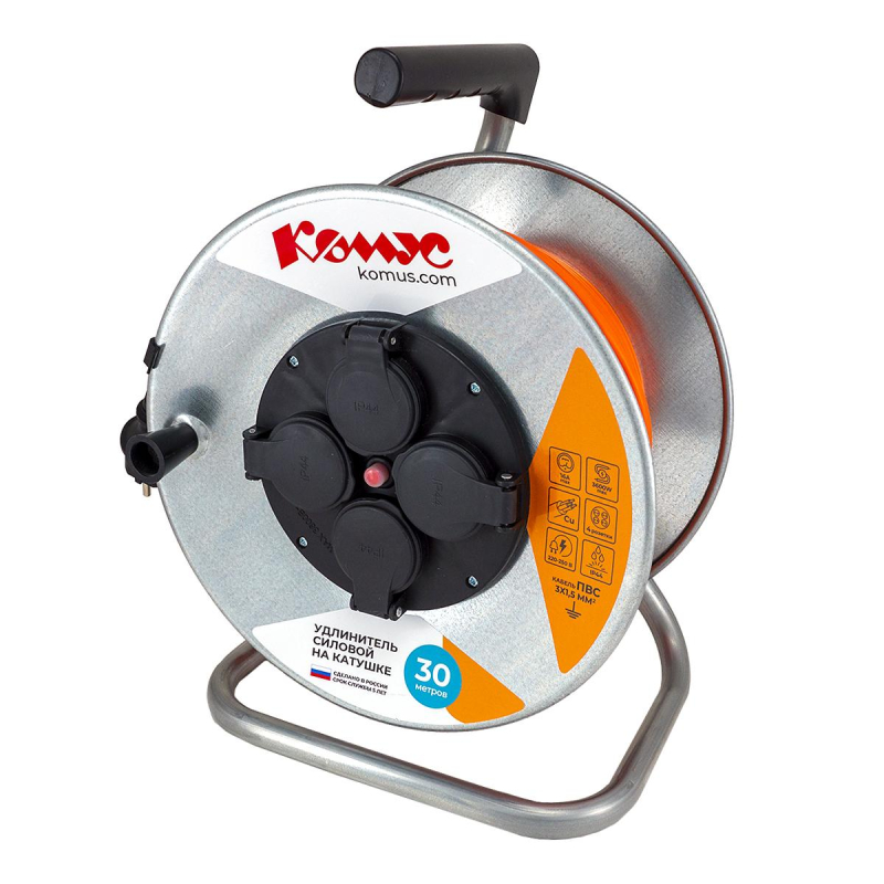 Силовой удлинитель на металлической катушке предназначен для подключения электрооборудования к сети. Каркас и корпус катушки изготовлен из оцинкованной стали. Розетки снабжены влагозащищенными защитными крышками по стандарту IP 44. Данный удлинитель можно использовать на открытом воздухе, стройках и в быту. Безопасность удлинителя обеспечивается за счет наличия термовыключателя, не позволяющего использовать изделие с превышением заявленных характеристик. Длина провода 30 метров 4 розетки с заземлением Провод ПВС 3x1,5 Заземление: есть Максимальная мощность 3600 Вт Максимальный ток 16А Температурный диапазон эксплуатации: от 1 до 25 градусов, с кратковременным повышением до 35 градусов.
