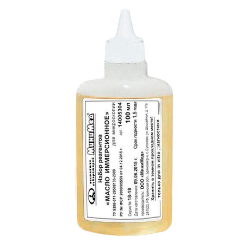 Используют в качестве необходимого вспомогательного реагента в световой микроскопии биологических препаратов при увеличениях объектива свыше 40. Иммерсионное масло, помещенное между объективом и препаратом, имеет показатель преломления, равный таковому стекла. Поэтому отклоненные мельчайшими деталями объекта лучи света не рассеиваются, выходя из препарата, а попадают в объектив, без потерь рефракции. Фасовка 100 мл.