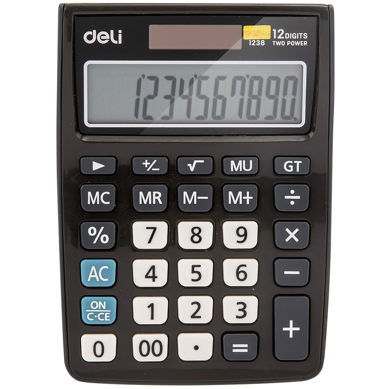 Простой и надежный настольный полноразмерный калькулятор Deli в пластиковом корпусе поможет выполнить базовые вычисления везде, где бы Вы ни находились. Подойдет ученикам старших классов, бакалаврам, магистрам, студентам, научным работникам. Позволяет корректировать введенное число, задавать настройки округления и количества знаков после запятой. Калькулятор производит все основные арифметические действия, вычисления с памятью, вычисления с процентами, извлечение квадратного корня и возведение в степень. Удобная клавиатура снабжена кнопкой ввода двойного нуля. Встроенный аккумулятор и солнечная батарея, образующие единую схему питания калькулятора, позволяют устройству работать при любом освещении. Разрядность дисплея: 12. Батарейка LR54 в комплекте. Наличие кнопки "Коррекция последнего введенного значения" - да. Автоматически отключается через 5 - 12 минут бездействия.