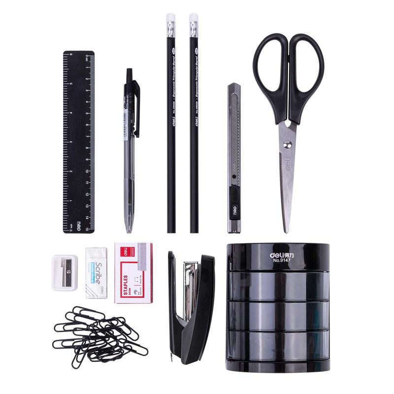 Настольный набор Deli позволяет держать все канцелярские принадлежности под рукой. Выполнен из высококачественного полипропилена. Набор канцелярский обеспечивает комфорт во время проведения переговоров, подписания документов, подчеркивая высокий статус обладателя. Настольный набор для руководителя включает в себя 12 предметов: подставка для пишущих предметов с выдвижными отделами для мелкоофисных принадлежностей, линейка, ножницы, нож канцелярский, степлер, скобы, ручка, два карандаша, скрепка, ластик, точилка, точилка. Цвет: черный.