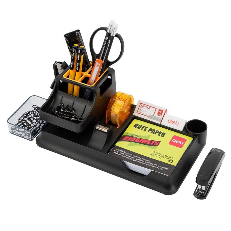 Настольный набор Deli позволяет держать все канцелярские принадлежности под рукой. Выполнен из высококачественного полипропилена. Набор канцелярский обеспечивает комфорт во время проведения переговоров, подписания документов, подчеркивая высокий статус обладателя. Настольный набор для руководителя включает в себя 17 предметов: подставка для пишущих предметов с отделами для мелкоофисных принадлежностей, линейка, ножницы, нож канцелярский, степлер, клейкая лента, скобы, ручка, два карандаша, скрепка, ластик, точилка, клейкие листочки, зажимы для бумаг, гвоздики, точилка. Цвет: черный. Размер изделия: 10,3х26х15см.