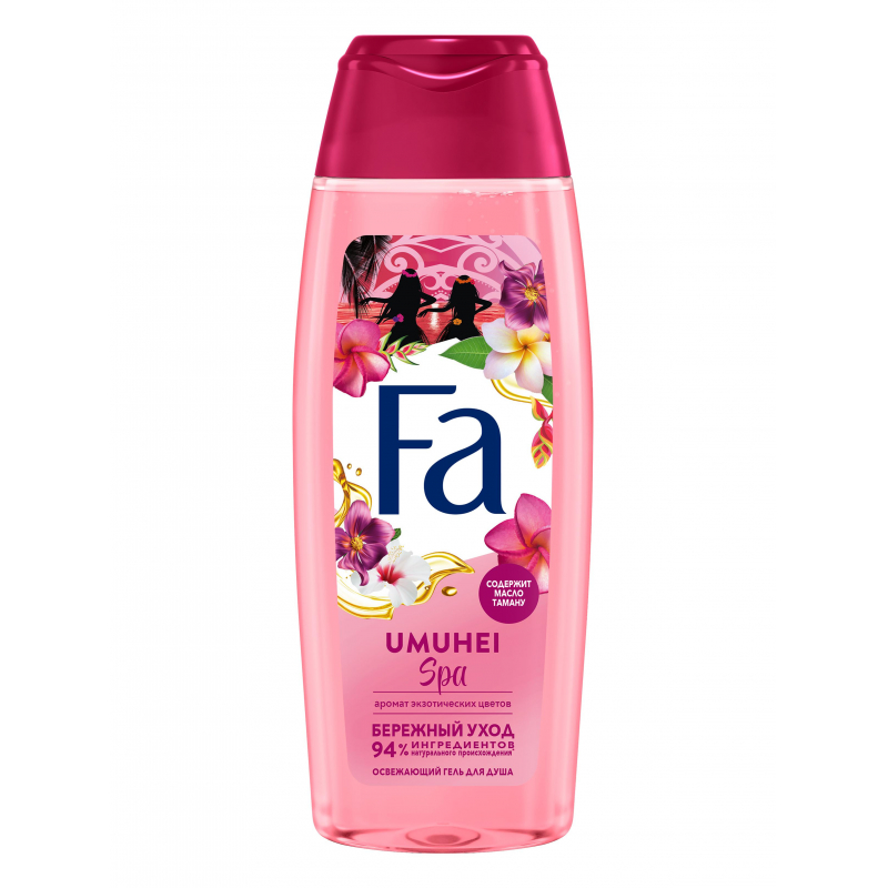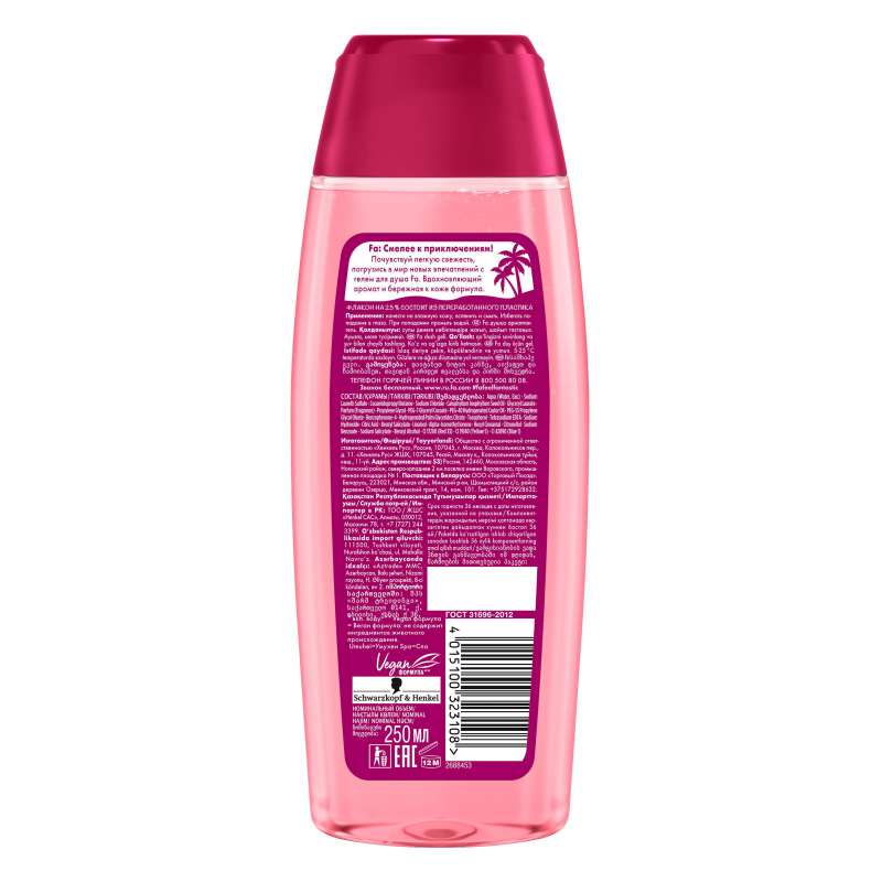 Fa: Смелее к приключениям! Почувствуй легкую свежесть, погрузись в мир новых впечатлений с освежающим гелем для душа Fa. Вдохновляющий аромат и бережная к коже формула. - Аромат экзотических цветов. - Содержит масло таману. - 94% ингредиентов натурального происхождения. - Флакон на 25% состоит из переработанного пластика. - Бережный уход. - Веган формула: не содержит ингредиентов животного происхождения. Состав: Aqua (Water, Eau), Sodium Laureth Sulfate, CocamidopropylBetaine, Sodium Chloride, Parfum (Fragrance), Guar Hydroxypropyltrimonium Chloride, Calophyllum Inophyllum Seed Oil, Coco-Glucoside, Caprylyl/Capryl Glucoside, Propylene Glycol, PEG-7 GlycerylCocoate, PEG-40 Hydrogenated Castor Oil, PEG-55 Propylene Glycol Oleate, Laureth-2, Tocopherol, Hydrogenated Palm Glycerides Citrate, Tetrasodium EDTA, Benzophenone-4, SodiumHydroxide, Citric Acid, Benzyl Salicylate, Linalool, Alpha-IsomethylIonone, Hexyl Cinnamal, Citronellol, Sodium Benzoate, Sodium Salicylate, Benzyl Alcohol, CI 17200 (Red 33), CI 19140(Yellow 5), CI 42090 (Blue 1)