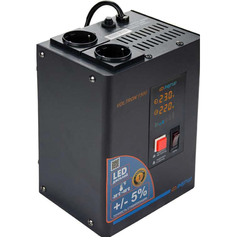Стабилизатор напряжения Энергия Voltron 1500 (5%) станет отличным выбором для тех, кому требуется обеспечить стабильное электропитание для однокомпрессорного холодильника, а также прочих электроприборов, отличающихся сравнительно высоким энергопотреблением. Обладая мощностью в 1,5 кВ·А, стабилизатор напряжения способен без усилий справиться с любыми перепадами напряжения, которые являются частым явлением в наших электросетях. Энергия Voltron 1500 (5%) способен обеспечить стабильное электропитание подключенным к нему приборам даже в тех случаях, когда амплитуда колебаний достигает 100 вольт. Кроме того, данное устройство обладает способностью снижать уровень импульсных помех до возможного минимума, что будет особенно полезно для владельцев техники, обладающей электронной начинкой. Отличными показателями обладает стабилизатор напряжения и в вопросе удобства использования. Энергия Voltron 1500 (5%) может использоваться в качестве настенного стабилизатора напряжения. Монтаж не вызовет каких-либо сложностей благодаря имеющимся на корпусе скобам. Еще одним преимуществом, заставляющим покупателей выбирать продукцию Энергия Voltron, является ее неприхотливость. Стабилизатор может работать в условиях с повышенной относительной влажностью (до 95 %), а также практически в любых температурных условиях - от -30 °С до +40 °С. Еще одним приятным свойством, которым обладает данная модель, является наличие у нее стандартных розетки и вилки, благодаря чему использовать Энергия Voltron 1500 (5%) можно сразу по прибытии на место без необходимости подключать устройства, требующие стабильного электропитания, к клеммам. Достаточно вставить вилку прибора в розетку стабилизатора и можно начинать работу. Энергия Voltron 1500 (5%) является одним из самых безопасных стабилизаторов напряжения, что доказывают сертификаты соответствия стандарту ISO 9001, а это значит, что вы можете спокойно разместить прибор и оставить его работать на длительное время - дни, недели и даже месяцы, не отвлекаясь на наблюдение за его работой. Всю необходимую информацию Энергия Voltron 1500 (5%) выведет на дисплей.