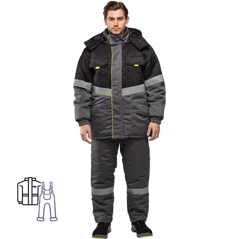 Костюм рабочий зимний мужской з43-КПК состоит из куртки и полукомбинезона. Цвет: серый/черный. Размер: 44-46. Рост: 182-188. Ткань верха: 'Стимул-250' (плотность 250 г/кв.м). Состав: 65% полиэстер, 35% хлопок. Утеплитель: - куртка, спинка, полочка: синтепон (3 слоя) 450 г/кв.м; - рукава, полукомбинезон: синтепон (2 слоя) 300 г/кв.м. Подкладка: Таффета (плотность 60 г/кв.м). Состав: 100% полиэстер. Светоотражающий материал: СОП Эталон. Яркость СОП: 450 кд. Куртка прямого силуэта, комбинированная, с притачной утепляющей подкладкой, с центральной застежкой на двухзамковую тесьму-молнию, с планкой из флиса под молнию в верхней части правой полочки. Планка огибает верхний край молнии во избежание соприкосновения ее с лицом, с ветрозащитным клапаном, фиксирующимся на контактную ленту в 4х точках. Ветрозащитный клапан состоит из 2х частей - одна из них клапан куртки, другая - пата воротника. Воротник-стойка. Съемный утепленный капюшон (верх+синтепон+подклад). По лицевому срезу проходит кулиса со шляпной резинкой, выведенной через 2 пары люверсов с фиксаторами. На затылочной части затяжник. Фиксируется на липучку. Втачные рукава, низ рукавов с манжетами, частично стянутыми эластичной тесьмой. С внутренними трикотажными напульсниками. Нижние детали ветрозащитного клапана и паты воротника выполнены из отделочной ткани салатового цвета с образованием канта на лицевой стороне шириной 3 мм. Вверх от шва притачивания средней части полочек, спинки, верхней части рукавов настрачивается СОП (ширина 5 см) с образованием канта шириной 3 мм салатового цвета. В нижней части внутреннего кармана настрочена лента Ф.И.О. Полукомбинезон на притачном утеплителе, с застежкой гульфика на тесьму-молнию, с бретелями, регулирующимися при помощи втачной эластичной тесьмы и пристегивающимися па пластмассовые пряжки-'трезубцы'. По линии талии 5 широких шлевок. Шлевки передних половинок - держатели 'трезубцев'. Передние половинки полукомбинезона с широким притачным поясом, который застегивается на две петли и пуговицы. На правой задней половинке полукомбинезона у бокового шва расположен карман для инструмента, который состоит из верхнего и нижнего кармана. Нижний карман поделен двойной строчкой на два. На изнаночной стороне настрочена лента Ф.И.О. В боковой шов вставлена трудноудаляемая нейлоновая этикетка и размерник. Ниже линии колена настрочен охватывающий СОП (ширина 5 см). Низ полукомбинезона обработан швом в подгибку с закрытым срезом шириной 2 см. Температурный диапазон: от ?25 °C до ?41 °C. Климатический пояс: IV/особый.