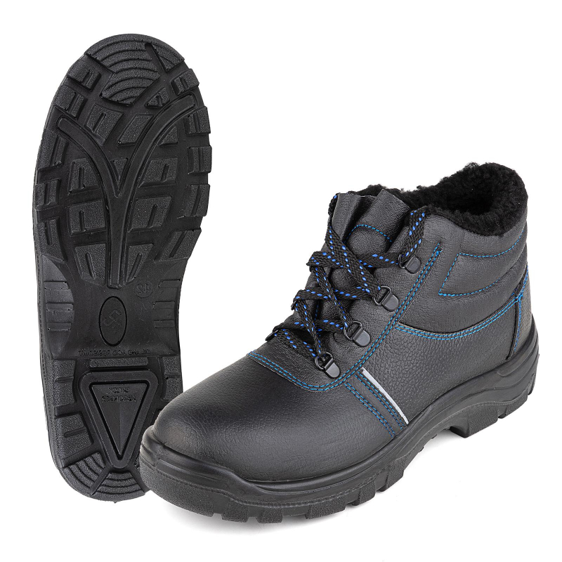 Ботинки рабочие с верхом из тисненой кожи для защиты ног от общих производственных загрязнений литьевого метода крепления подошвы из однослойного полиуретана. Размер: 38. Ботинки с настрочной союзкой, задинкой, глухим клапаном и мягким кантом на подкладке из искусственного меха. С внешней и внутренней сторон в местах настрачивания союки проложен светоотражающий кант. Стелька вкладная. Ботинки фиксируются на ноге с помощью шнуровки, проходящей через металлические петли. Ботинки изготавливаются с термопластичным подноском ударной прочностью 5 Дж. Подошва МБС. Глубина профиля ходового слоя подошвы составляет 3,5 мм. Цвет ботинок черный.