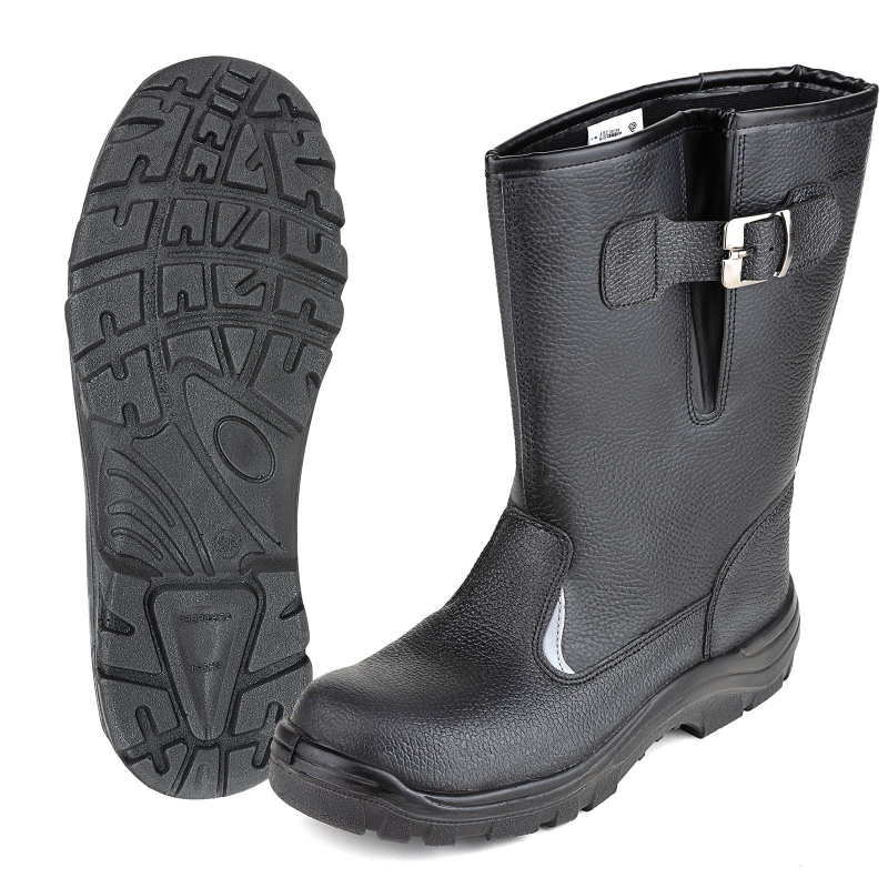 Сапоги рабочие c регулируемым голенищем для надежной фиксации и комфортного максимально плотного прилегания обуви к голени с помощью ремня и пряжки. Голенище изготовлено из винилискожи, союзка и задинка - из кожи. Подкладка и стелька выполнены из текстильного материала. Сапоги изготавливаются с металлическим подноском ударной прочностью 200 Дж, литьевого метода крепления подошвы из однослойного полиуретана. Глубина профиля ходового слоя подошвы составляет 3,5 мм. Цвет сапог - черный. Высота сапог - 26 см.