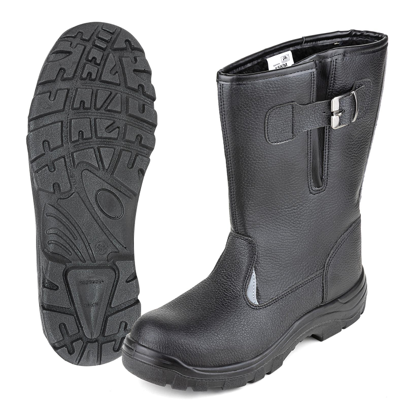 Сапоги рабочие c регулируемым голенищем для надежной фиксации и комфортного максимально плотного прилегания обуви к голени с помощью ремня и пряжки. Размер: 39. Голенище изготовлено из винилискожи, союзка и задинка - из кожи. Подкладка и стелька выполнены из искусственного меха. Сапоги изготавливаются с металлическим подноском ударной прочностью 200 Дж, литьевого метода крепления подошвы из однослойного полиуретана. Глубина профиля ходового слоя подошвы составляет 3,5 мм. Цвет сапог- черный. Высота сапог- 26 см.
