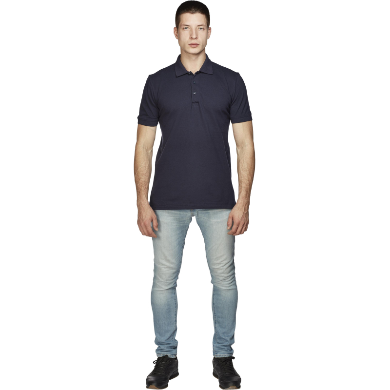 Рубашка Поло темно-синего цвета. Размер: 40-42. Классическое поло шьется из хлопчатобумажной ткани пике (это сложное плотное переплетение волокон, дающее характерную текстуру в мелких ячейках). Поло прямого кроя с коротким рукавом. Ворот рубашки имеет отложной воротник с тремя пуговицами на планке.