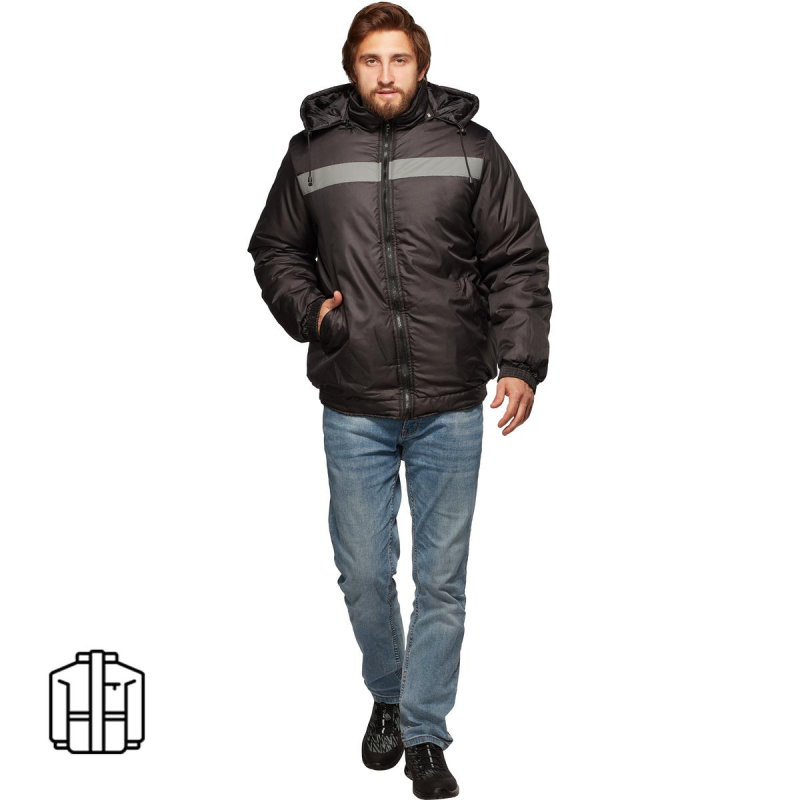 Спецодежда зимняя куртка-бомбер черная мужская. Размер: 56-58. Рост: 170-176. Цвет: черный. Светоотражающая полоса шириной 5 см. Ткань: 100% полиэстер. Подкладка: Таффета (полиэстер). Утеплитель: синтепон. Климатический пояс: II и III. Рекомедуется для использования в ЖКХ, строительстве, пищевой и нефтегазовой отраслях. ГОСТ 12.4.303-2016.