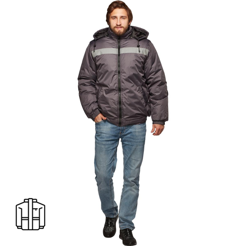 Спецодежда зимняя куртка-бомбер серая мужская. Размер: 56-58. Рост: 182-188. Цвет: серый. Светоотражающая полоса шириной 5 см. Ткань: 100% полиэстер. Подкладка: Таффета (полиэстер). Утеплитель: синтепон. Климатический пояс: II и III. Рекомедуется для использования в ЖКХ, строительстве, пищевой и нефтегазовой отраслях. ГОСТ 12.4.303-2016.