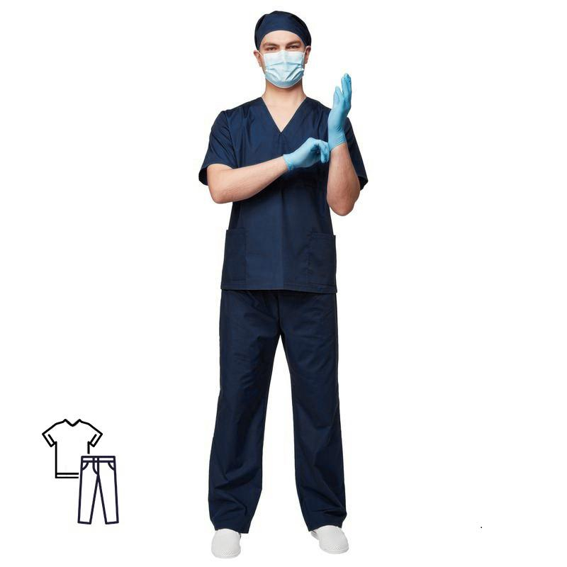 Костюм хирурга универсальный м05-КБР темно-синего цвета. Размер: 52-54. Рост: 158-164. Изготовлен из ткани ТиСи. Состав - 65% полиэстера и 35% хлопка. Плотность материала составляет 120 г/кв. м, благодаря чему обеспечивается легкость изделия. Ти-Си - материал, приятный на ощупь, гигиеничен и долговечен. Не мнется, легко и быстро стирается, быстро сохнет. Долго сохраняет свой первоначальный яркий цвет. Ткань 'дышит', благодаря входящему в состав хлопку, имеет повышенный срок службы и проста в уходе, благодаря полиэстеру. Медицинский костюм состоит из куртки и брюк, подходит и для женщин, и для мужчин. Куртка с коротким рукавом и нагрудным карманом, свободный покрой обеспечивает удобство в работе. Брюки прямые на резинке. Униформа рекомендована для сферы красоты и здоровья: медицинские учреждения, центры.