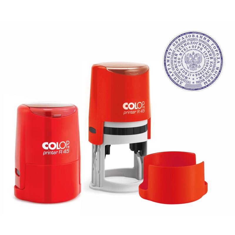 Надежный пластиковый корпус с автоматическим окрашиванием текста. Диаметр оттиска - до 45 мм. Нижняя крышка позволяет блокировать корпус в сложенном компактном виде, защищает клише. Используется для основных или дополнительных печатей организации, гербовой печати. В комплекте: оснастка, нижняя крышка, синяя сменная подушка E/R45 (артикул 44729), демпферный слой для крепления клише, наклеен на текстовую площадку. Клише заказывается отдельно.Внимание! Все сменные штемпельные подушки, которыми комплектуется продукция Colop, заправлены краской Noris (Германия) на водной основе с добавлением глицерина и предназначены для проставления оттисков на бумагу и пористые поверхности. При необходимости проставления оттисков спиртсодержащей краской при помощи автоматической оснастки, стандартную подушку, идущую в комплекте, необходимо заменить на специальную совместимую со спиртосодержащими красками, во избежание затвердевания подушечного материала. Заказывается индивидуально.