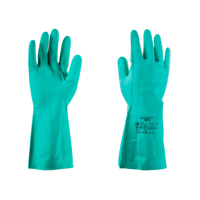 Нитриловые перчатки с хлопковым напылением, зеленые. Размер: 7, S. EN374: JKLOPT. EN388: 4101Х. Толщина: 0,38 мм. Длина: 330 мм. Защитные свойства: К80 (защита от кислот концетрацией до 80%), Щ50 (защита от щелочей концентрацией до 50%), Вн (водонепроницаемые), Бм (от микроорганизмов), Нс (от сырой нефти), Нм (от нефтяных масел и продуктов тяжелых фракций ), Нл (защита от легских фракций). Внутри флокированы 100% хлопком. Обладают высокой устойчивостью к водорастворимым неорганическим кислотам (до 80%), щелочам (до 40%), солям, спиртам, растворителям. Текстурная поверхность ладони в виде ромбов для лучшего захвата. Слегка расширенная манжета для вентиляции. Отличная эластичность и комфорт. Высокая износоустойчивость.