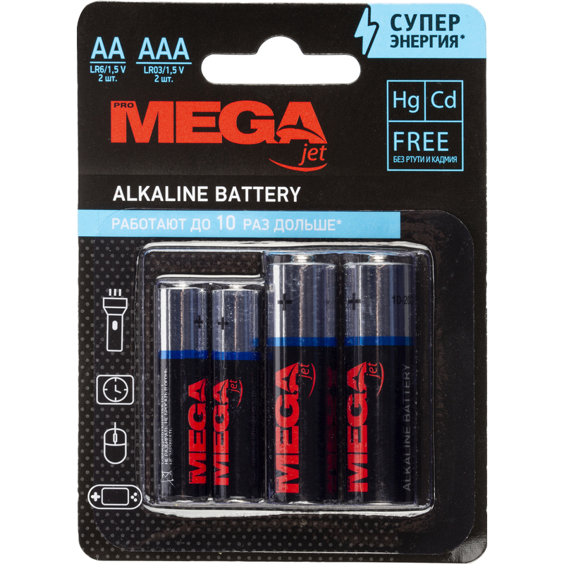 Алкалиновые батарейки Promega пальчиковые AA LR06 (2 шт.) + мизинчиковые AAA LR03 (2 шт.), напряжение -1.5 В, 4 штуки в упаковке. Алкалиновые батарейки подходят для различных электронных устройств небольшого размера: пульты дистанционного управления телевизором, портативные цифровые аудиоплееры, карманные радиоприемники, фотоаппараты и другие беспроводные гаджеты. Изготовлены по новой формуле для более надежной и продолжительной работы устройств с высоким потреблением энергии. Щелочные или алкалиновые батарейки обладают электрической емкостью в несколько раз большей, чем солевые. А также более высокой мощностью, что очень важно для работы устройств в полную силу.