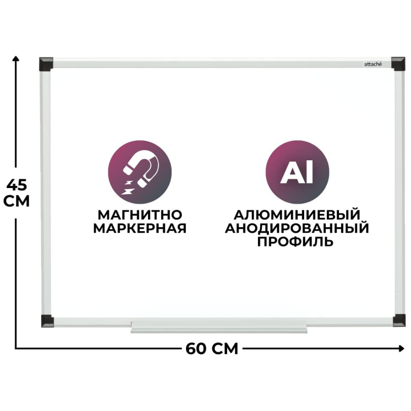 Стильная ультратонкая магнитно-маркерная доска Attache Economy Ultra Black, 45x60 см. В основании доски прочный гофролист из картона толщиной 4 мм. Толщина металла 0,3 мм. Лаковое покрытие. Светлая алюминиевая рама толщиной 6 мм с прочными пластиковыми уголками черного цвета. Магнитно-маркерная доска используется во время презентаций или для отображения материала, который нужно наглядно представить. Металлическая белая глянцевая поверхность позволяет крепить на доску важную информацию с помощью магнитов,использовать бумагу для заметок с клейким краем (стикеры) или писать специальными whiteboard маркерами сухого стирания, которые легко удаляются. Таким образом, на доске удобно размещать информацию, которая часто меняется. Эти доски используются для комфортной работы с информацией в организациях, учебных заведениях и домашних офисах. При удалении записей применяются только специальные губки-стиратели в комбинации со специализированным спреем для более тщательной очистки полотна. Для продления срока службы доски рекомендуется использовать фирменные маркеры и губки. Соблюдение правил ухода и эксплуатации способно обеспечить срок службы рабочей поверхности магнитно-маркерной доски более 10 лет. В комплекте съемная полка для маркеров, набор для навесного крепления, инструкция по установке. Расположение горизонтальное/ вертикальное. Страна-производитель - Россия. Поставляется готовой для использования. Не требует дополнительных манипуляций по отделению защитных слоев с пишущих поверхностей. Товар относится к ценовому сегменту "суперэконом". Имеет упрощенные характеристики и более простую упаковку. Отвечает основным требованиям потребления.