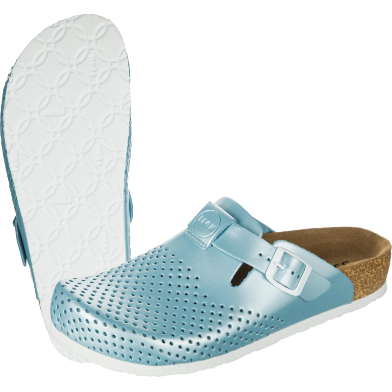 Сабо Leon голубого цвета. Материал верха обуви: натуральная кожа. Метод крепления подошвы: литьевой. Подносок: термопластичный. Подошва: полиуретан. Обувь Leon позволит правильно распределить нагрузку в зоне стопы и подарит комфорт во время использования. Подошва обуви изготовлена из прочного противоскользящего полиуретана, надежно скрепляет все компоненты и делает походку уверенной. Натуральная пробка в сочетании с современными материалами идеально повторяет форму стопы. Стелька Memory Gel, имеющая высокие амортизационные свойства, благодаря чему снижает нагрузку на голеностопный сустав и позвоночник, предотвращая боли в спине. Верх стельки выполнен из мягкой натуральной кожи. Система "Антишок" уменьшает ударную нагрузку в пяточной части, обладает противоскользящими свойствами, что значительно снижает нагрузку на суставы и позвоночник, уменьшая чувство усталости и дискомфорта при ходьбе.