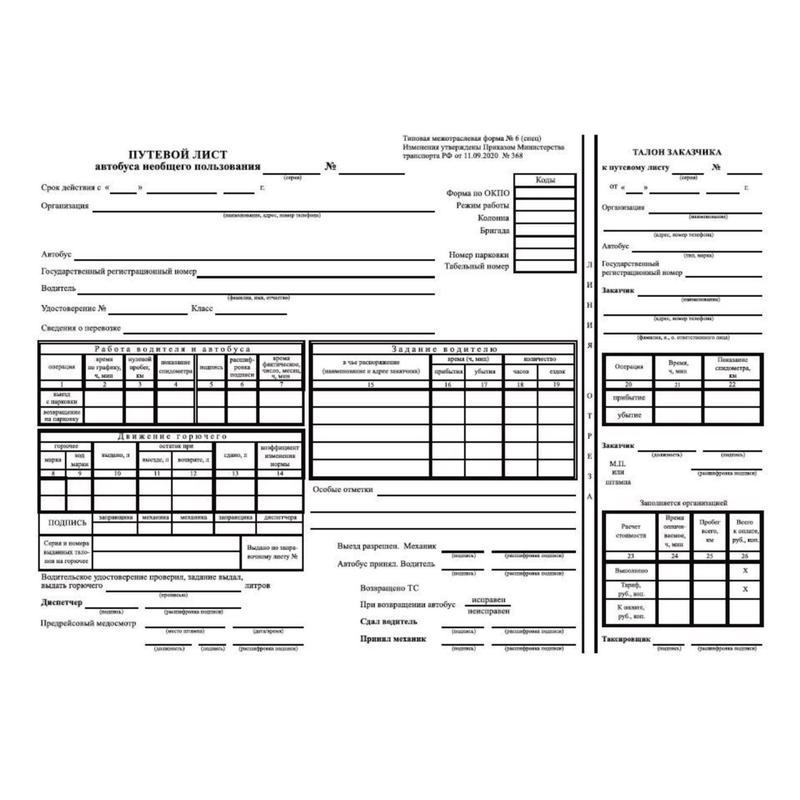 Путевые листы должны оформлять организации и предприниматели, которые применяют в работе различные транспортные средства. Функция путевого листа - зафиксировать те сведения, на основании которых водителю начисляют заработную плату. Путевой лист автобуса необщего пользования соответствует типовой межотраслевой форме № 6 (спец). Изменения утверждены Приказом Министерства транспорта РФ от 11.09.2020 № 368. В комплекте 100 бланков стандартного размера А4 на писчей бумаге. Путевой лист разделен линией отреза на две части: путевой лист автобуса необщего пользования и талон заказчика. В путевом листе на первой странице отражаются сведения о транспортном средстве, работе водителя и автобуса, движение горючего, задание водителю, отметки о медосмотре, подписи диспетчера, водителя, механика. В талоне заказчика фиксируются информация об организации, данные заказчика, операции убытия и прибытия, расчет стоимости. На второй странице путевого листа указываются маршрут движения, простои на линии, результат работы автобуса, зарплата, отметка о послерейсовом медосмотре.