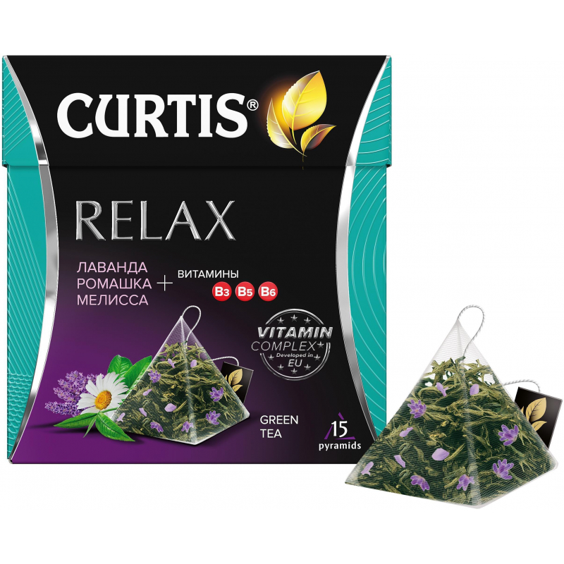 Зеленый чай Curtis 'Relax' 25.5 г 15 пакетиков (пирамидки) - китайский листовой чай, обогащенный витаминами В3, В5, В6. Антиоксиданты зеленого чая, польза мелиссы, ромашки, лаванды и сила витаминов способствуют снятию стресса. Насладись чашкой чая Curtis Relax для внутренней гармонии. Удивительные сорта чая в купажах Curtis, неожиданные сочетания крупных кусочков ягод и фруктов дарят разнообразие изысканных, ярких вкусов и ароматов. Выпить чашку чая Сurtis - это удовольствие от момента побыть с собой и помечтать. Сurtis мотивирует людей мечтать и осуществлять мечты, рожденные за чашкой чая. Curtis. Выбирай для себя 1. 15 пирамидок. 2. Мелисса и Витамин B3 способствуют снижению раздражительности. 3. Витамин B5 помогает снять физическую усталость и стресс. 4. Витамин B6 способствует равновесию эмоционального фона. 5. Аромат ромашки успокаивает и помогает расслабиться. Состав: китайский зеленый листовой чай, ромашка, мелисса, ароматизатор 'травы швейцарских Альп', лаванда, лепестки василька и мальвы, витамины В3, В5, В6. Способ приготовления: Возьмите одну пирамидку на чашку (150-200 мл) и залейте кипяченой водой, доведенной до температуры 85°C. Настаивать 4 минуты. Условия хранения: хранить в сухом месте, в плотно закрытой упаковке. Страна производства: Россия. Номер ТУ 10.83.13.001-45678395-2018