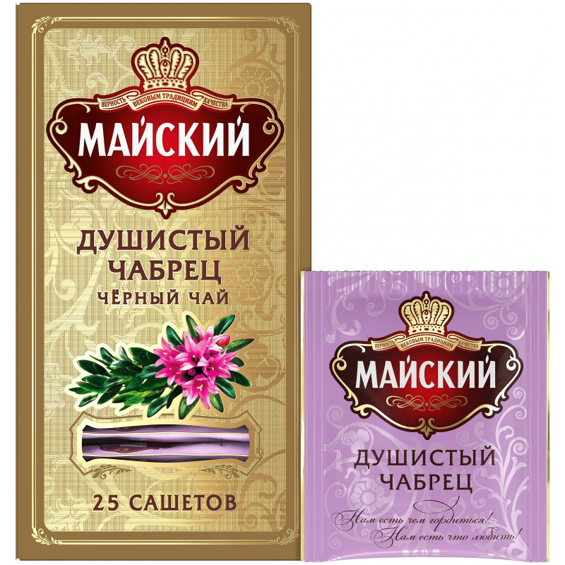 Чай Майский черный Душистый Чабрец 50 г 25 пакетиков. Золотая Коллекция - это жемчужина чая Майский. Эксклюзивная коллекция черного чая с яркими вкусами и ароматами в роскошной золотой упаковке. Наслаждайтесь классическим вкусом и свежим ароматом чая Майский! Чай Майский "Душистый Чабрец" - это абсолютная гармония классического черного чая и душистого аромата пряного чабреца. Откройте для себя пленительные оттенки богатого аромата в каждой чашке! Секрет высокого качества чая 'Майский' в отборных листьях весеннего сбора, придающих ему свежий аромат и мягкий классический вкус, хорошо знакомый российскому потребителю. С 'Майским' чаепитие становится таким душевным. Хорошо там, где мы вместе! Состав: чай черный байховый цейлонский с чабрецом и мятой. Способ приготовления: залейте кипятком (200 мл) 1 пакетик и дайте настояться 2-4 минуты. Вес: 50 г; 25 пакетиков. Тип упаковки: картонная. Условия хранения: хранить в сухом месте, в плотно закрытой упаковке. Страна производства: Россия. Номер ТУ 9191-001-56843012-03