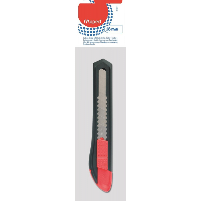 Нож канцелярский Maped Start, 18 мм. Эргономичный. Ручной фиксатор лезвия. Встроенный стопор лезвия. Пластиковый корпус черного цвета с красной вставкой. Упакован в прозрачный блистер с европодвесом.